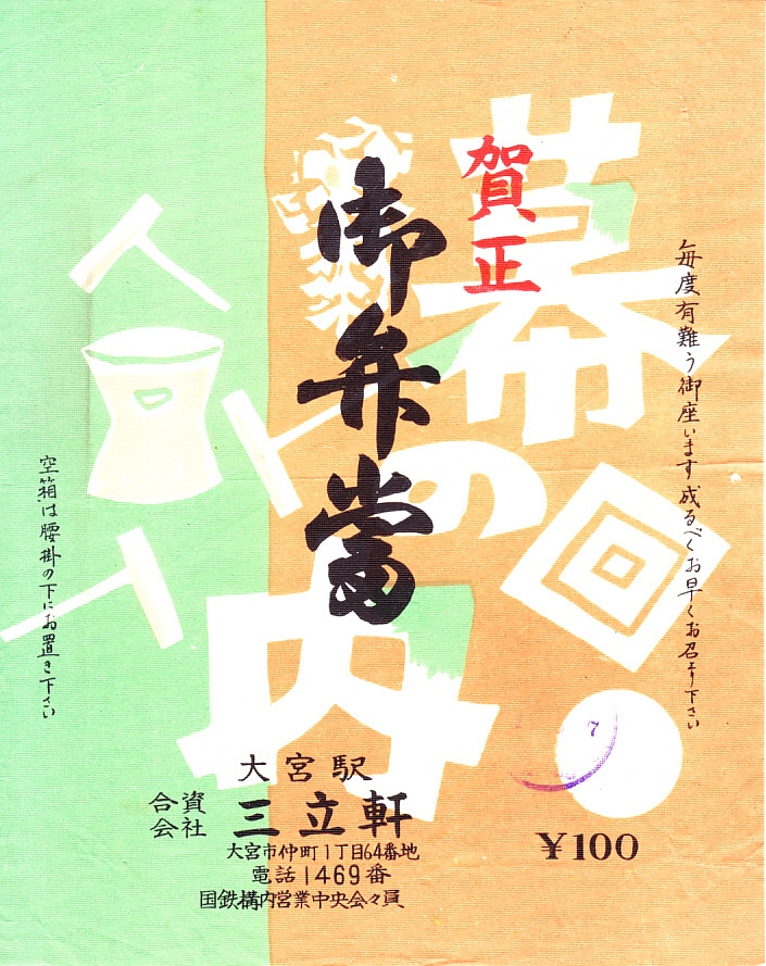 1960年代の調製と思われる、昔の大宮駅弁の掛紙。当時に各地の駅弁屋で実施されていた正月の掛紙で、ここでは通常版の「御弁當」の掛紙に赤い「賀正」の文字を追加した。