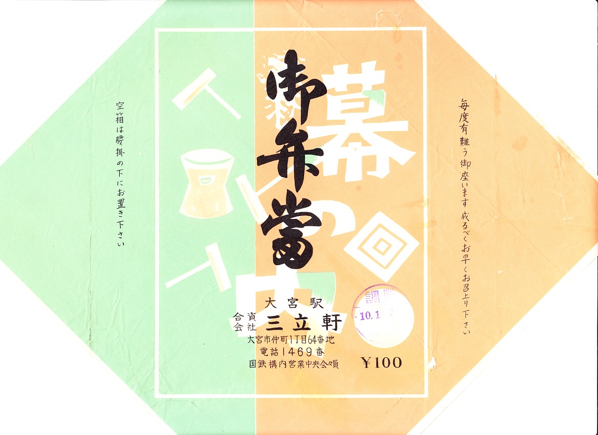 1960年代の10月1日の調製と思われる、昔の大宮駅弁の掛紙。駅弁の名前は「御弁当」で、背景に「幕の内」と書いた、当時の普通弁当。