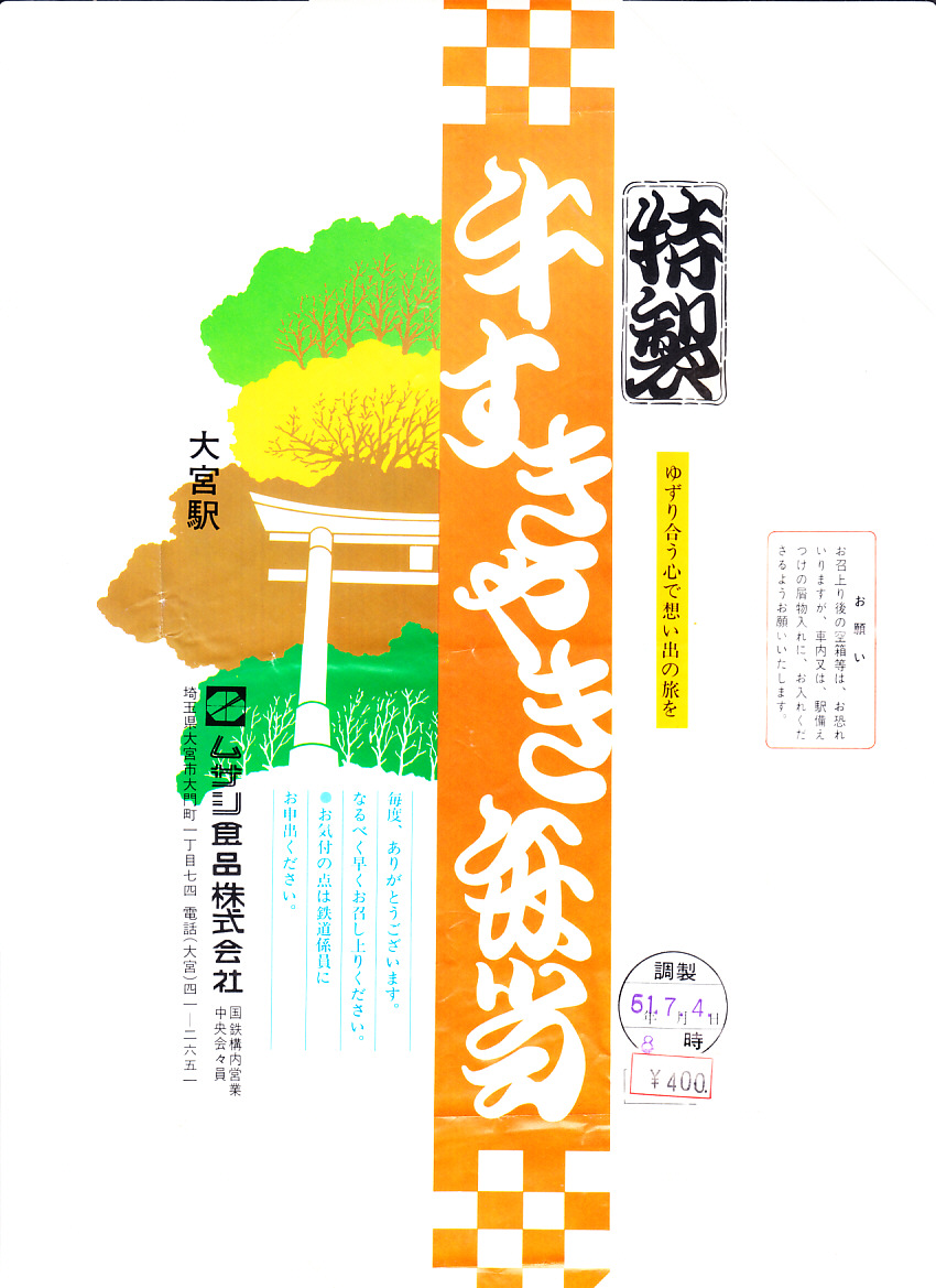 1976(昭和51)年7月4日8時の調製と思われる、昔の大宮駅弁の掛紙。鳥居で大宮を表したのかどうか。