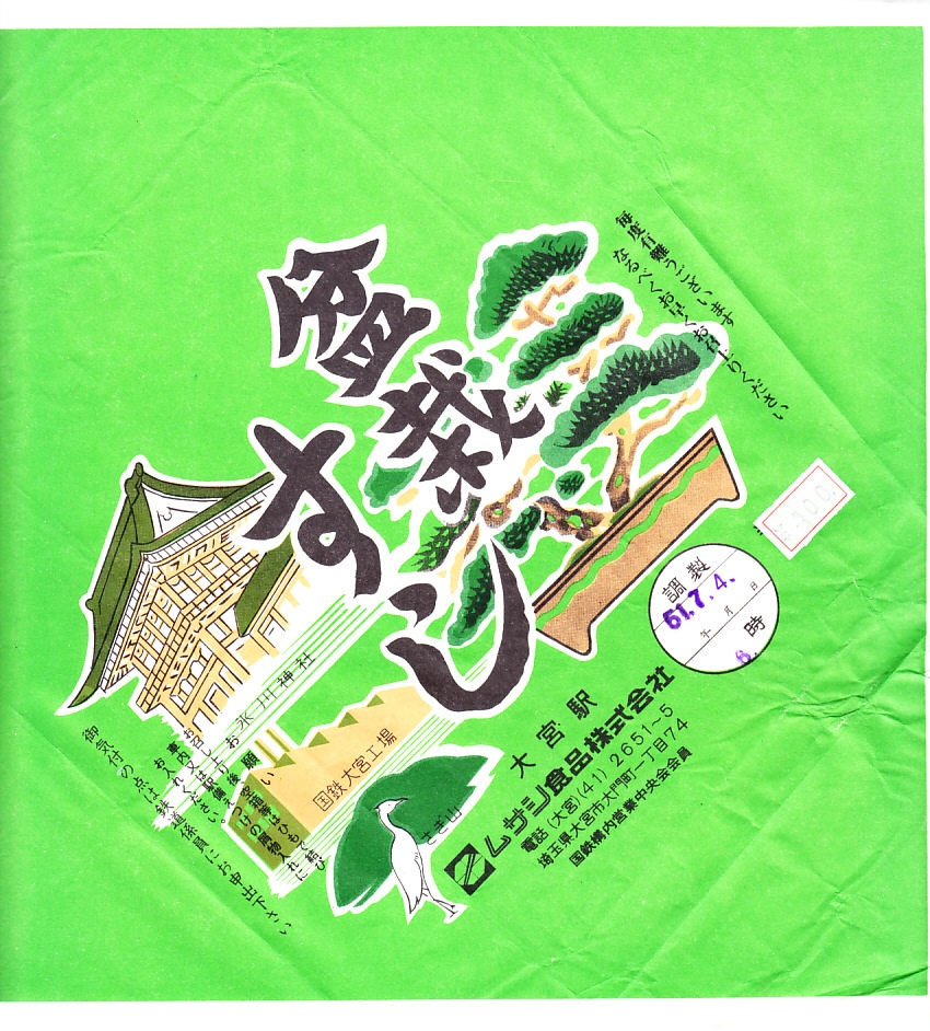 1976(昭和51)年7月4日の調製と思われる、昔の大宮駅弁の掛紙。氷川神社、国鉄大宮工場、さぎ山と盆栽を描く。大宮が盆栽の町であることにちなみ、酢飯をれんこん、かまぼこ、ハム、チーズなどで覆った、人気の駅弁だったそうな。昭和40年代までは穴をあければ盆栽の鉢にできるという丸い陶器を使ったという。