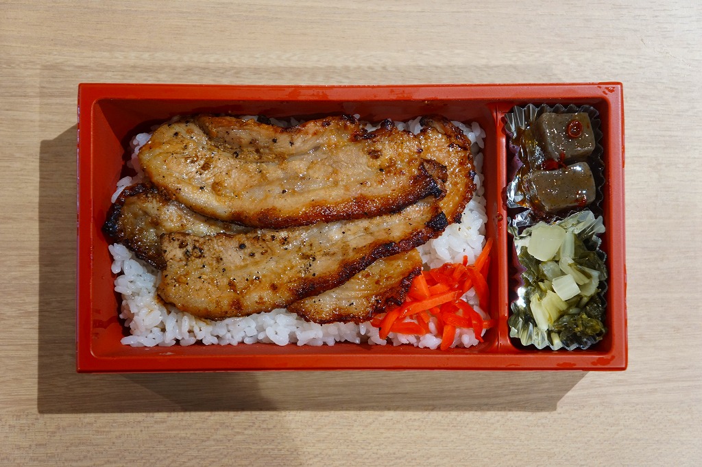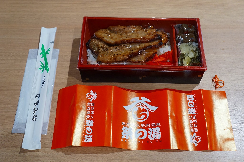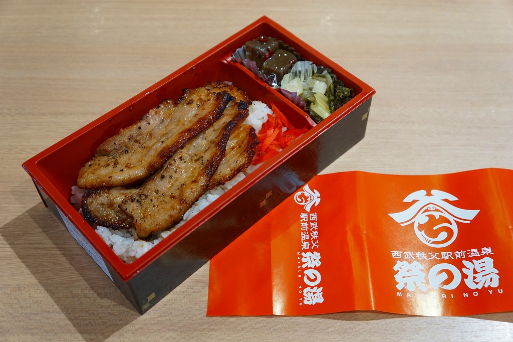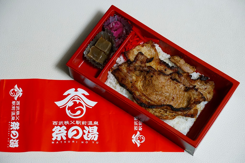上記の弁当「祭の湯(秩父名物わらじかつ弁当)」と同じく、駅の温浴施設「祭の湯」のフードコートで買える弁当。食券販売機は共通だが、注文カウンターは異なるという不思議な売り方。中身はわらじかつが炙り豚味噌に変わっただけで、掛紙も容器もその他の具も価格も同じ。炙り豚味噌というよりはベーコン状の焼豚がカリカリして、こちらは食べておいしい焼豚丼。価格は2018年時点で950円、2019年10月時点で970円、2023年時点で1,090円。