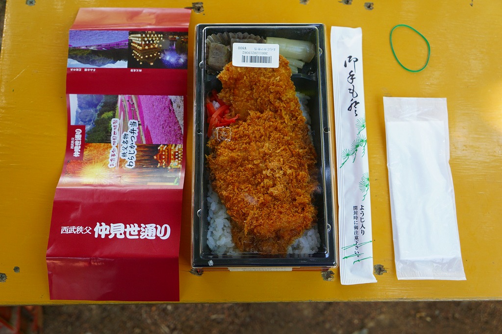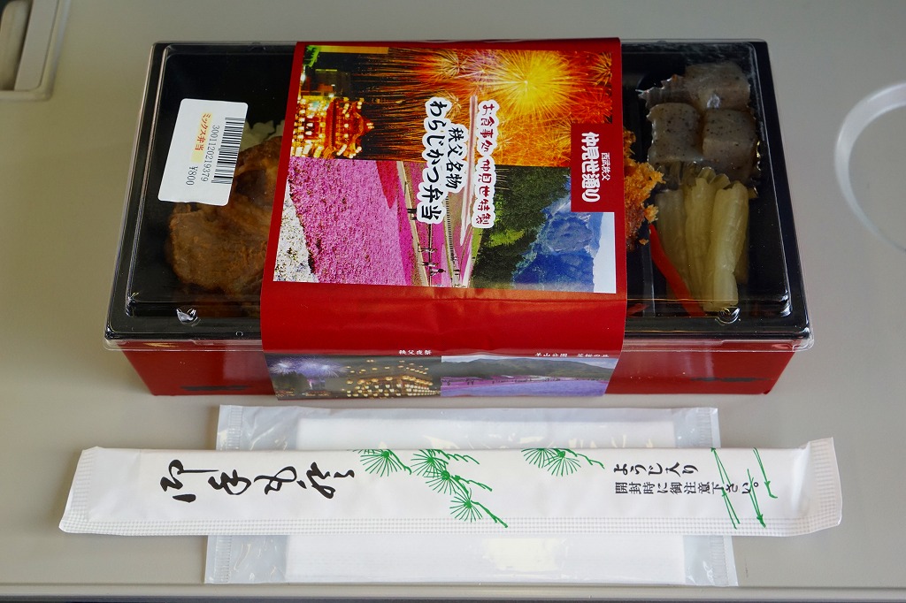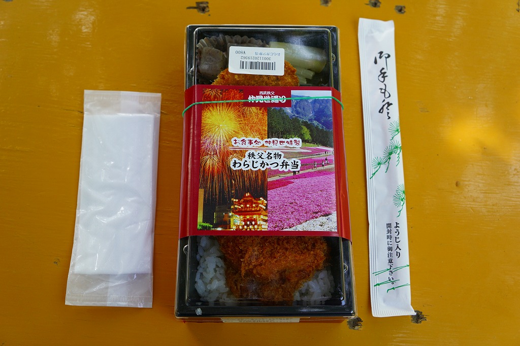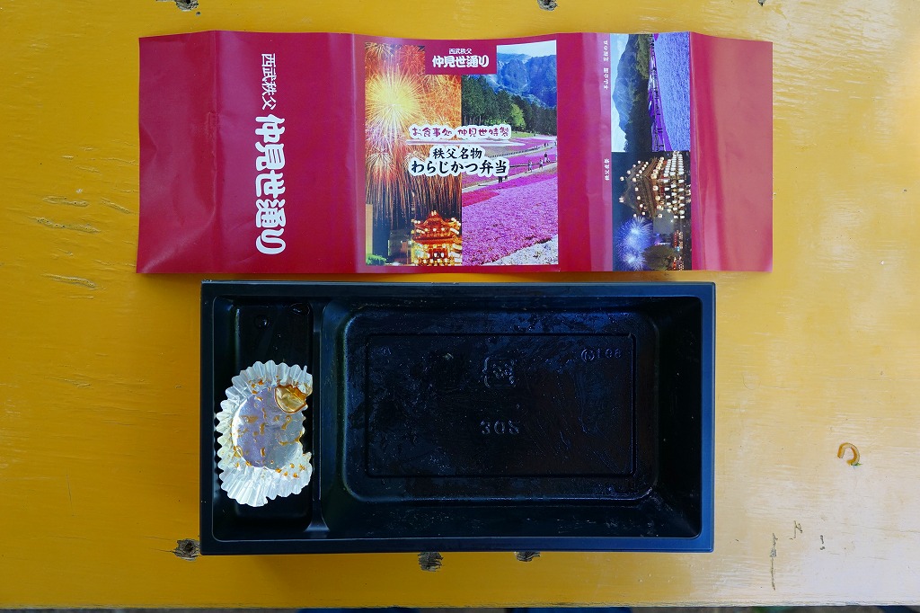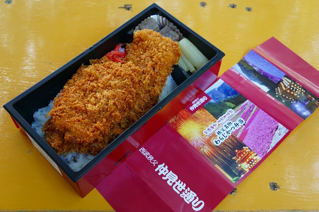 2016(平成28)年の西武秩父駅の温泉施設への建て替えのため、下記の駅弁らしい姿をしたわらじかつ弁当を販売する西武鉄道直営食堂が閉店していたため、この代替品を購入。翌年5月のリニューアルオープン後は、これが西武秩父駅弁の主力商品になってしまった。どうみても駅弁でなく、近所のスーパーか弁当屋のお惣菜。価格は2016年の購入時で618円、2018年時点で680円。2024年に来てみたら、売店での弁当の販売がなくなっていた。