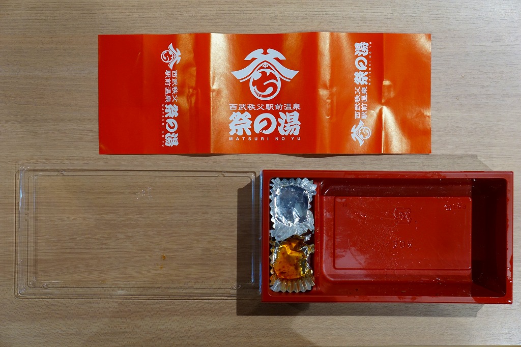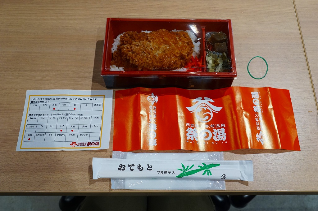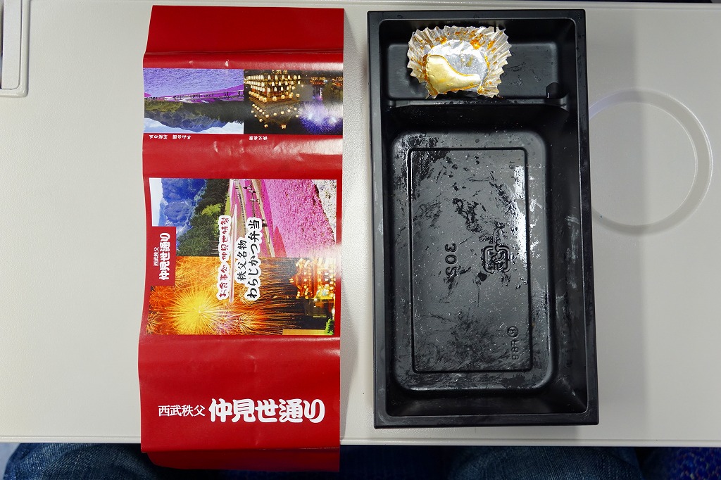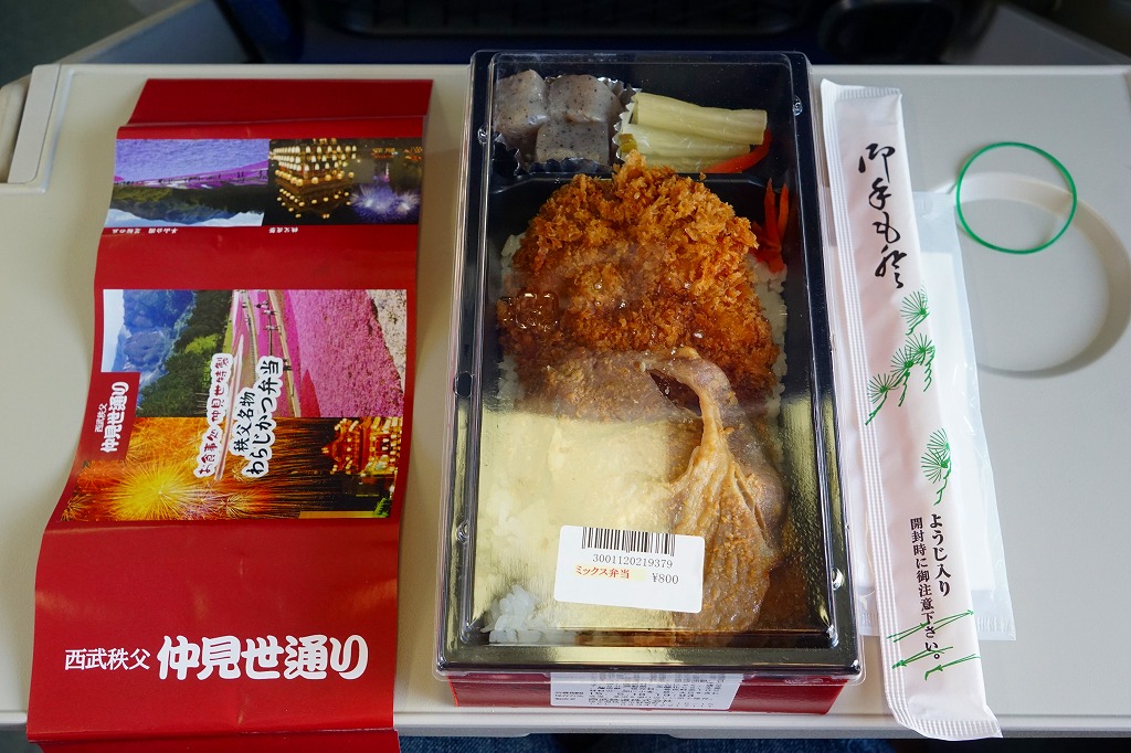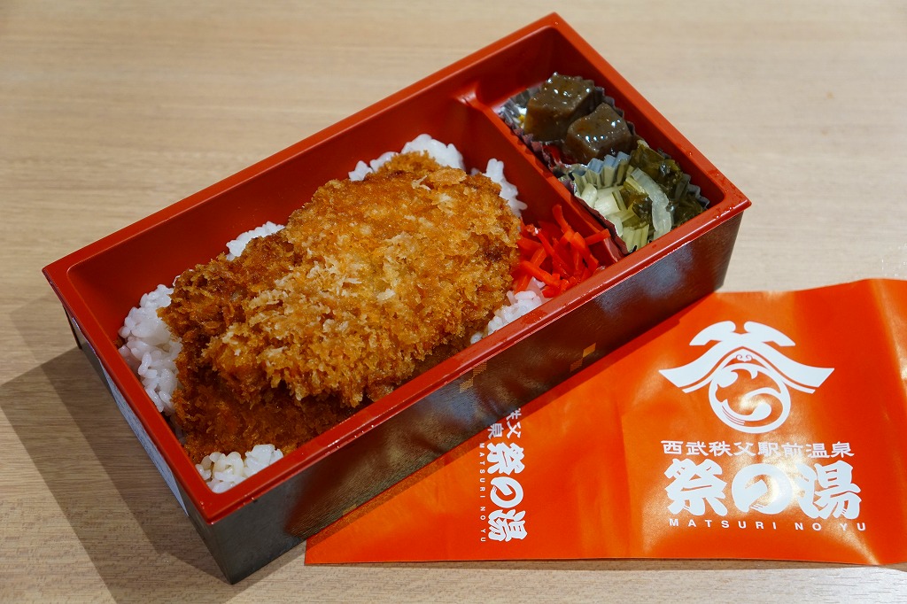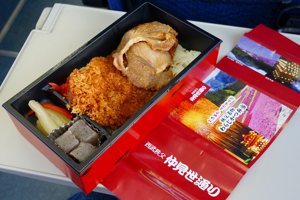 2016(平成28)年の西武秩父駅の温泉施設への建て替えのため、下記の駅弁らしい姿をしたわらじかつ弁当を販売する西武鉄道直営食堂が閉店していたため、この代替品を購入。翌年5月のリニューアルオープン後は、これが西武秩父駅弁の主力商品になってしまった。どうみても駅弁でなく、近所のスーパーか弁当屋のお惣菜。価格は2016年の購入時で618円、2018年時点で680円。2024年に来てみたら、売店での弁当の販売がなくなっていた。