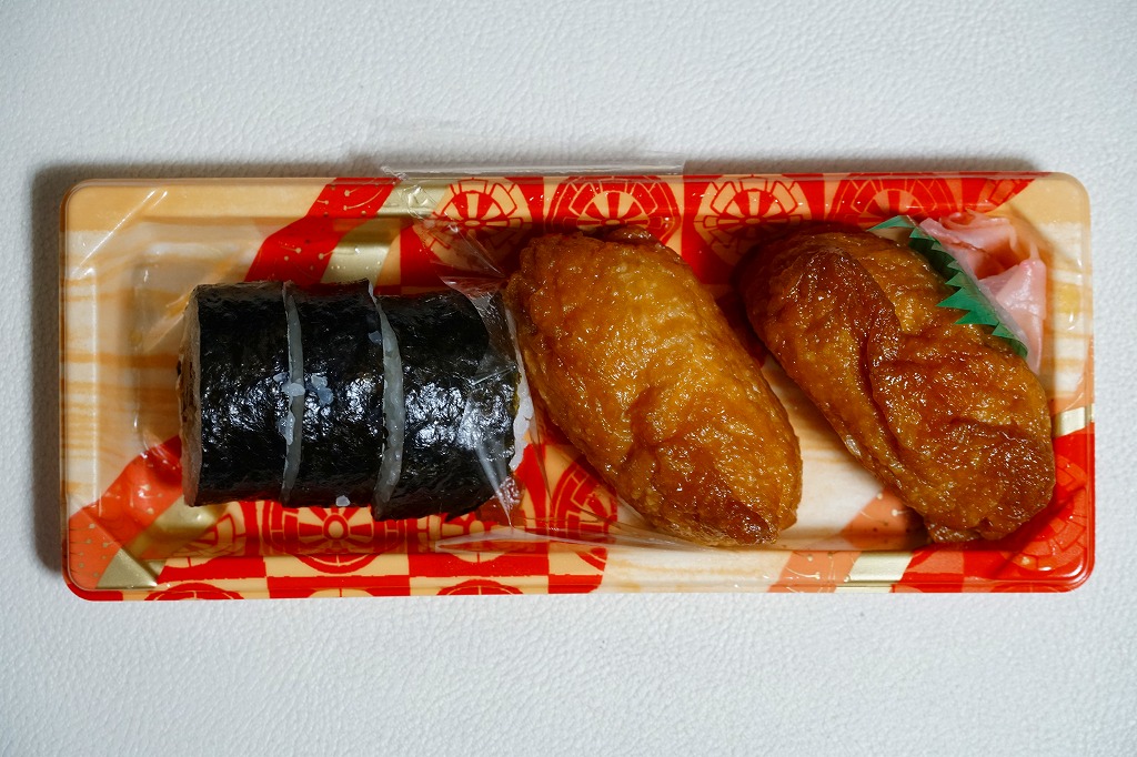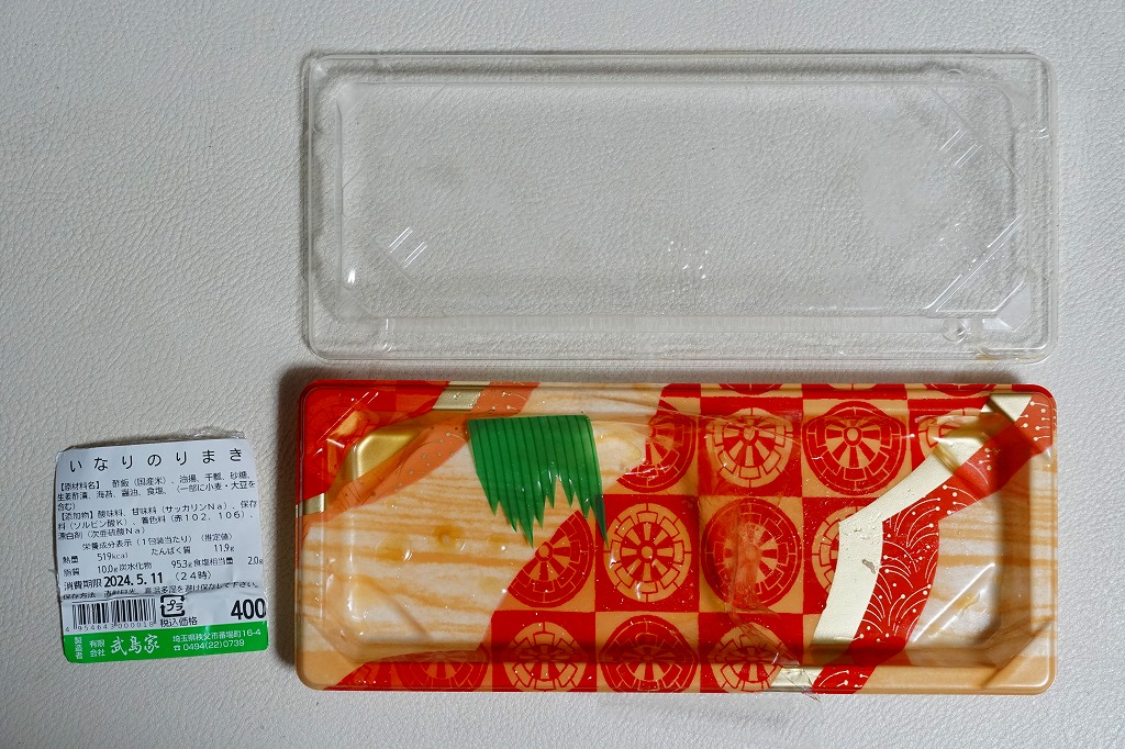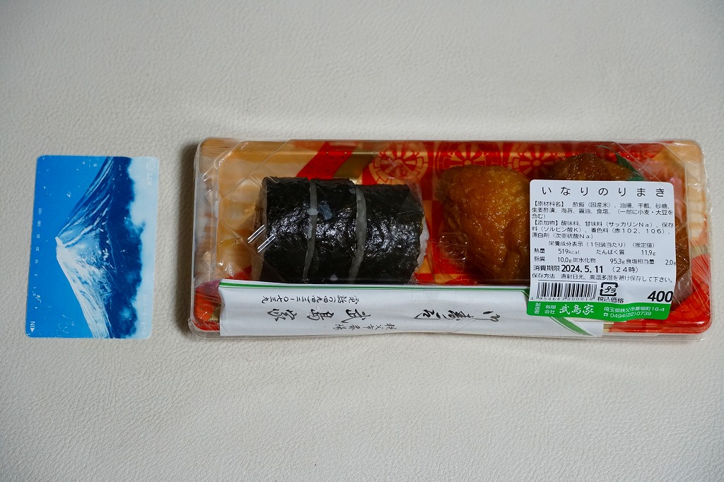 2024年に西武秩父駅で購入。いなりずし2個と、細巻きより太いかんぴょう巻3個。つまり、お惣菜。このように西武秩父駅では、改装で2016年に釜飯やわらじかつ弁当のような駅弁が消え、改装後に外観はともかく中身はわらじかつやおにぎりや幕の内だった弁当も消え、売店から駅弁がなくなってしまった。調製元は秩父市街で大正時代から続くいなりずしとのりまきの専門店であり、これはまだ地元の商品ではあるが、広域配送のコンビニ向け惣菜工場に替わるのも時間の問題か。