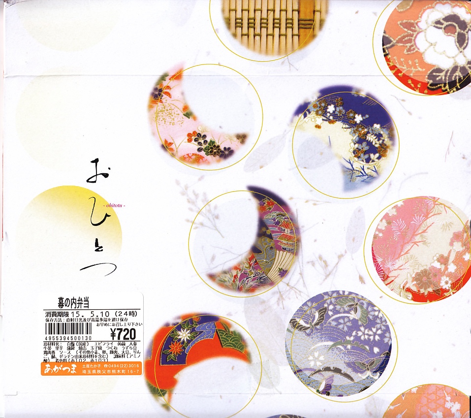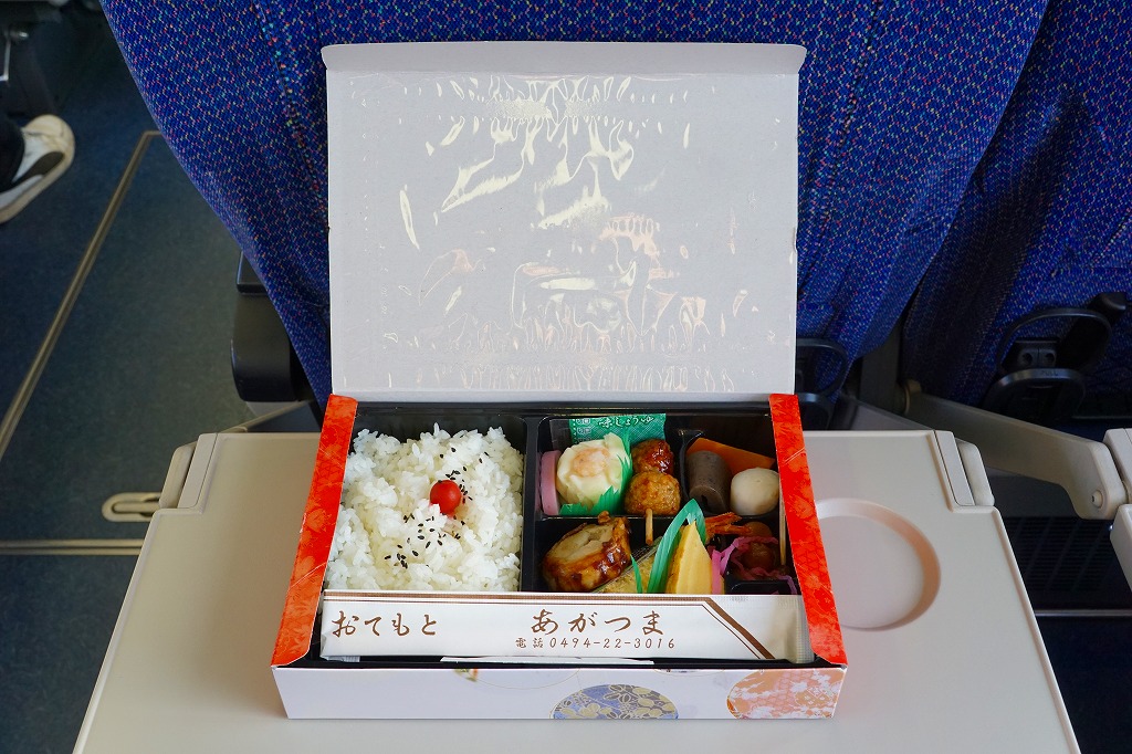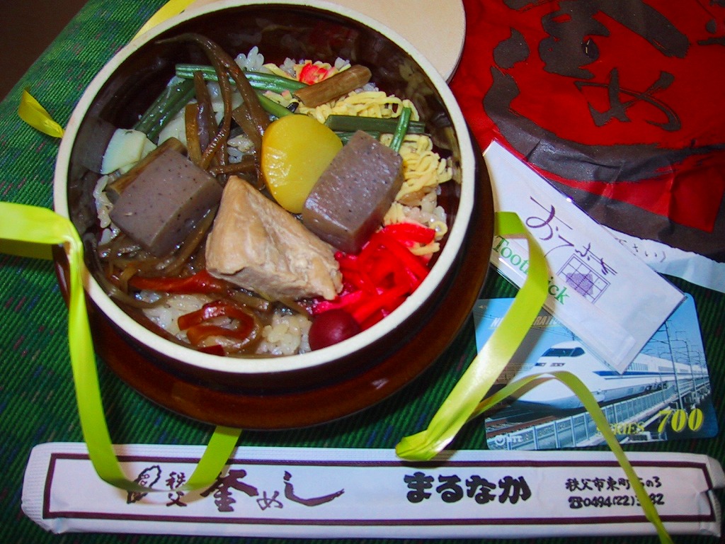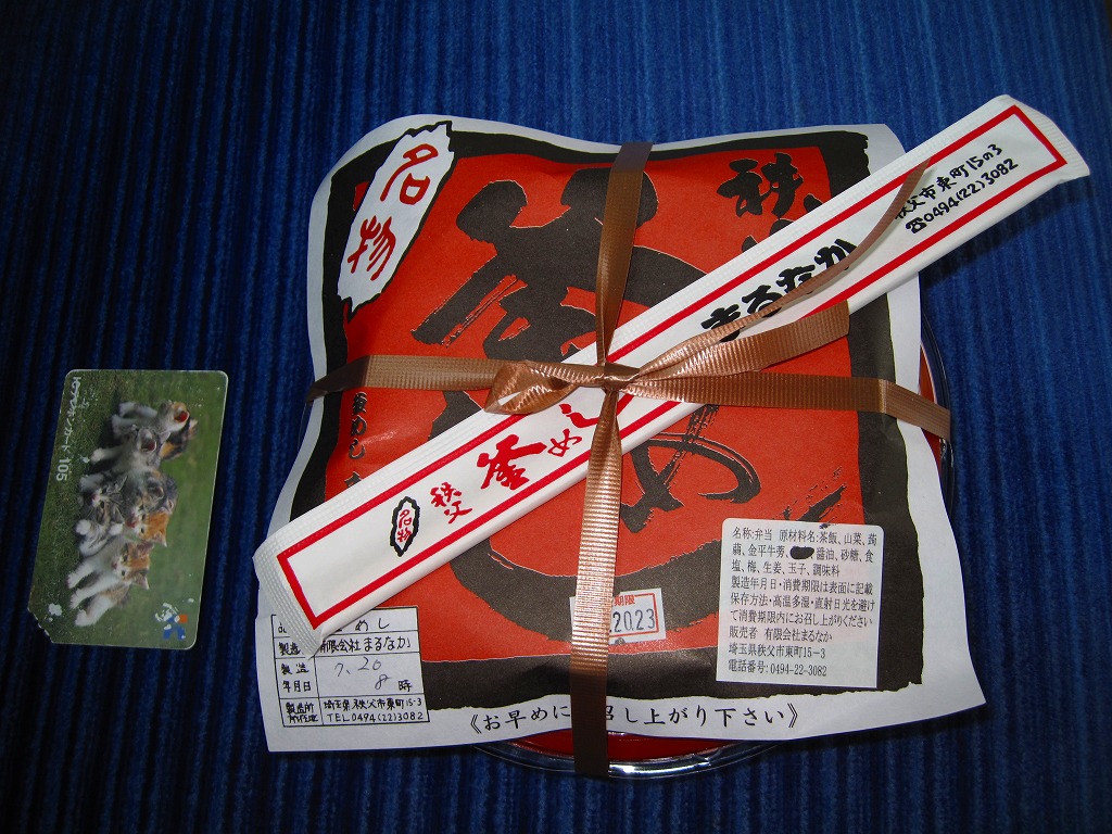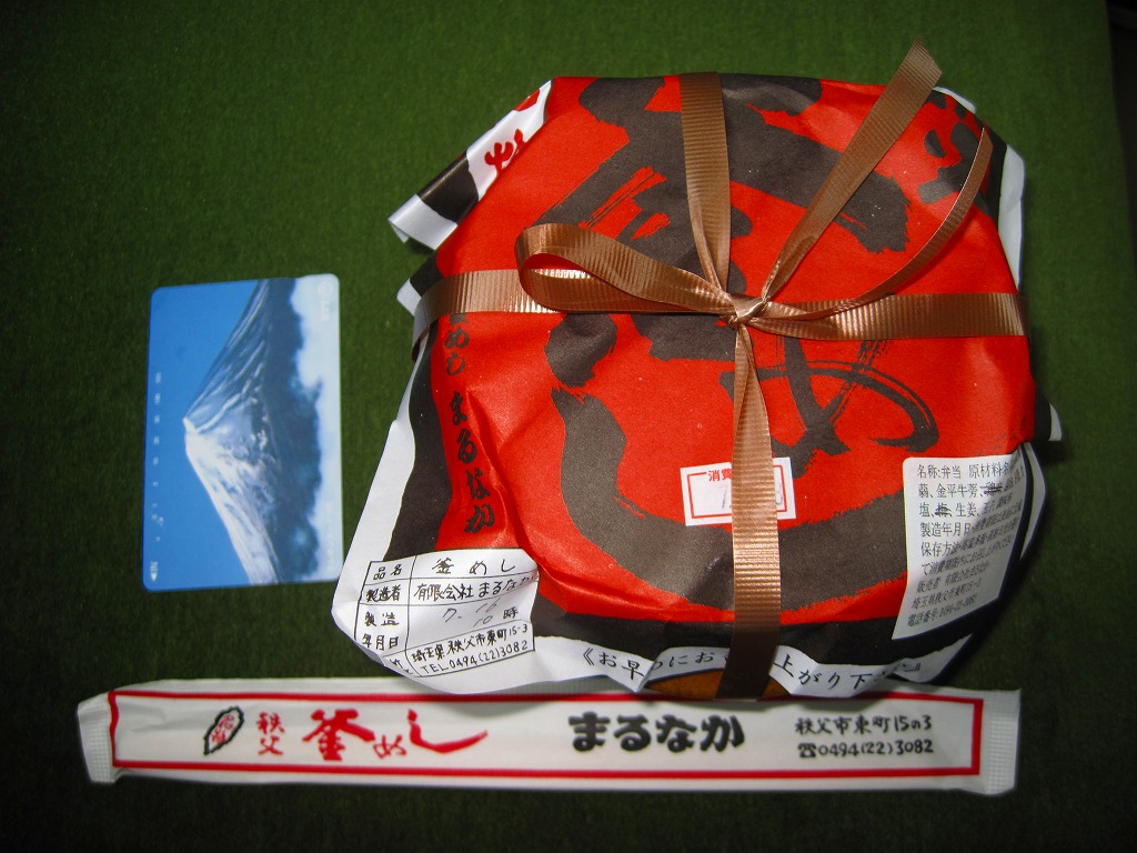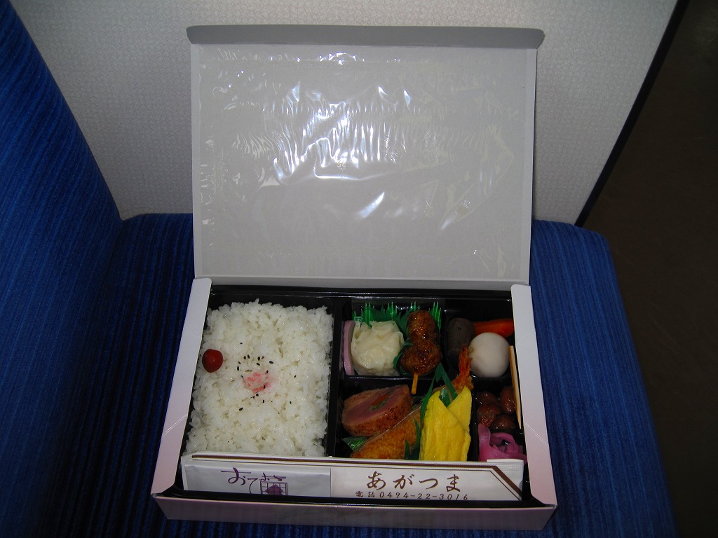西武秩父駅の幕の内駅弁。中身は日の丸御飯にエビフライ、鶏肉巻、玉子焼、肉団子、しゅうまい、極薄なかまぼこ、こんにゃくなどの煮物、金時豆など。市販のボール紙製長方形の容器をそのまま使う外観も、黒いトレーに入った中身の風味も、まるっきり惣菜弁当。「秩父釜めし」と同じ売店で売られるが、釜飯とは調製元は異なる。価格は2000年代で700円、2014年4月の消費税率改定で720円。2024年に来てみたら、売店での弁当の販売がなくなっていた。