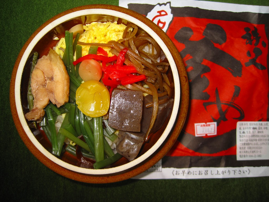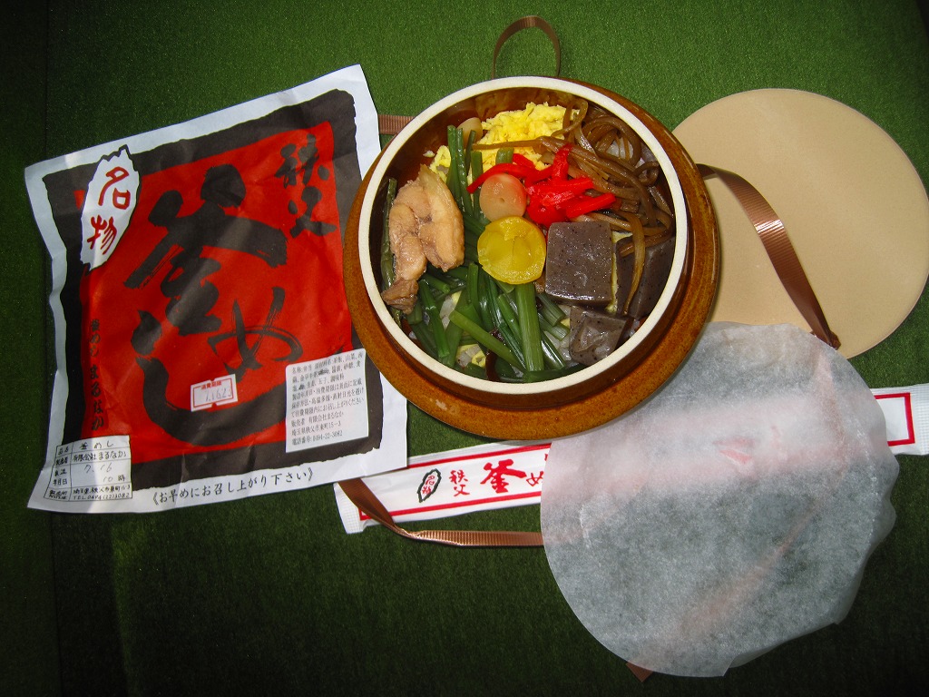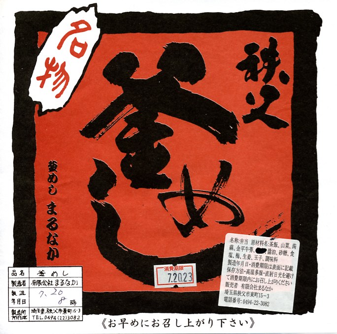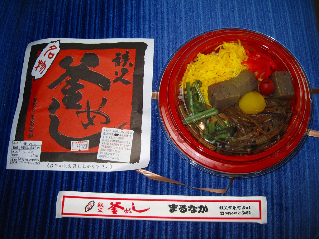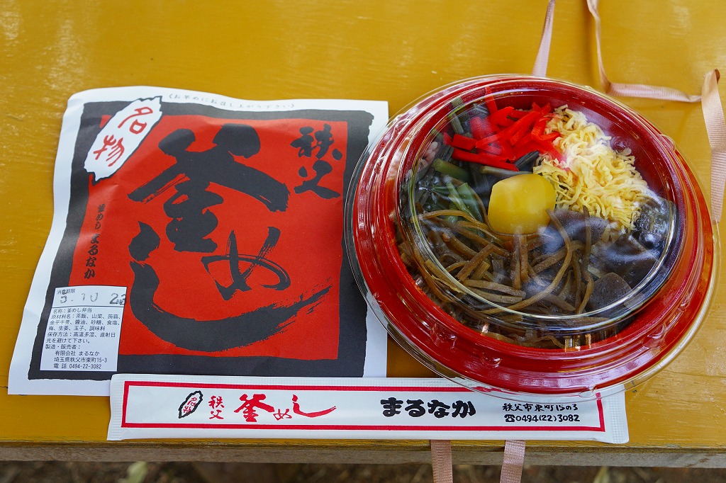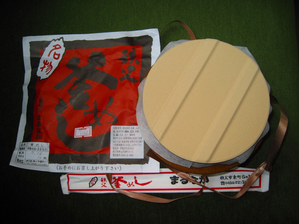フタまで陶製の小ぶりで本格的な釜を容器に使用、味付け御飯の上を鶏肉・山菜・錦糸卵・こんにゃく・栗・梅・紅生姜で覆う。紅生姜の強い匂いが他の具の香りや味をすっかり消してしまっているのが残念。西武秩父駅は池袋からの特急レッドアローが発着する秩父観光の玄関口だが、駅弁屋は朝は開いていなく夕方は売り切れているため、観光のついででの駅弁の入手はなかなか難しい。特に釜めしは。なお、駅弁の名称は駅売店の掲示による。西武秩父駅に駅弁ありと雑誌やテレビが発信し始めた頃には、なくなっていた感じ。