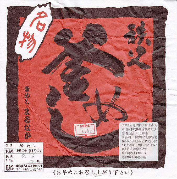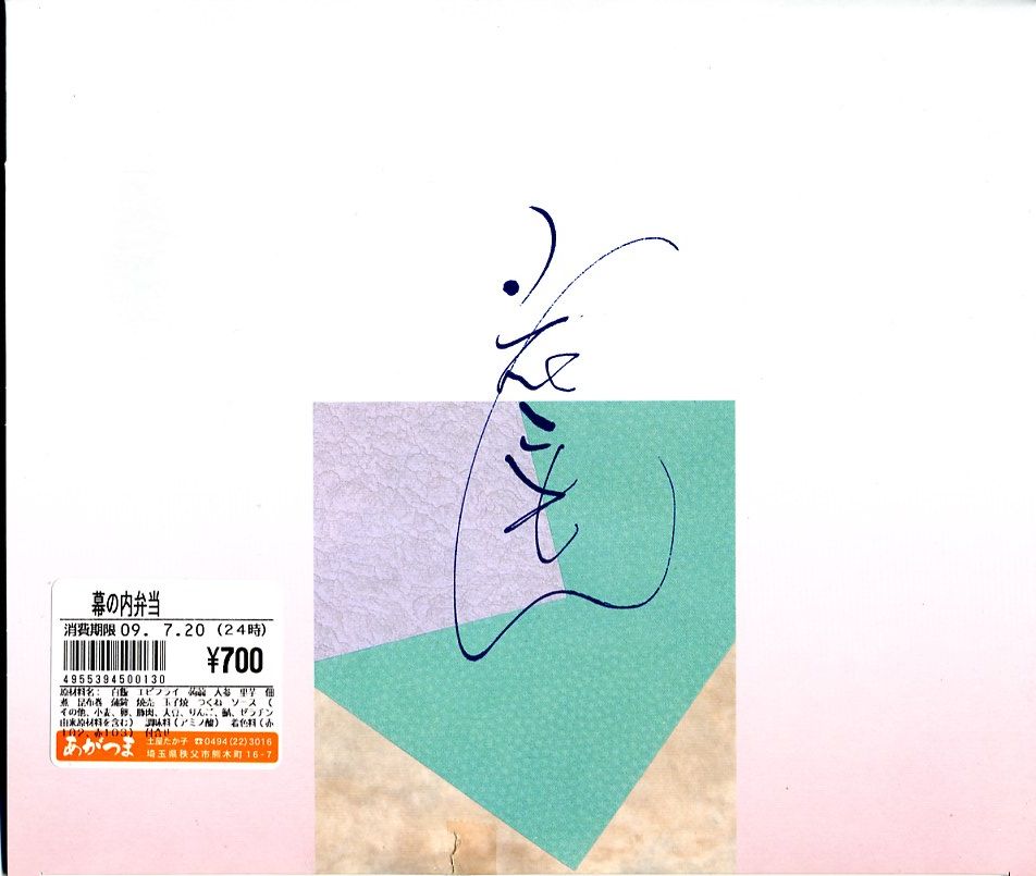 2009(平成21)年7月20日に購入した、西武秩父駅弁の掛紙。現在と絵柄は変わらないが、注意書きや調製情報の位置や内容が異なる。容器と中身は2015年のものと同じであった。