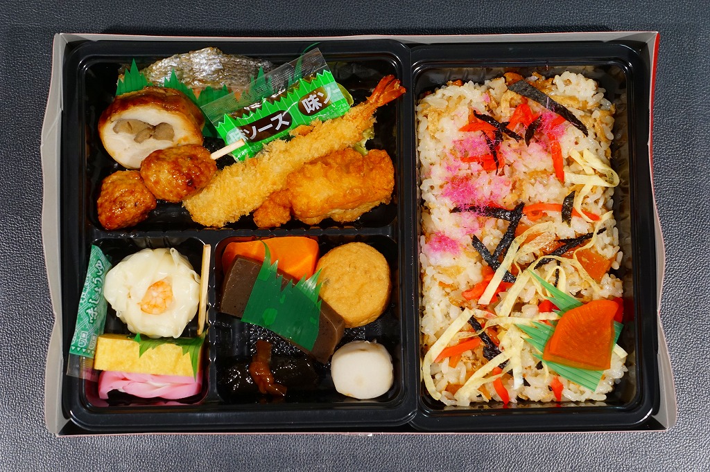 2017(平成29)年5月の西武秩父駅商業施設リニューアルオープン後に見つけた弁当。ボール紙の箱に黒いプラ製トレーを入れる、市販の仕出し弁当向け容器に、五目飯、焼鮭、エビフライ、鶏唐揚、鶏肉巻、串肉団子、焼売、かまぼこ、玉子焼、コンニャク、サトイモ、ニンジン、がんもどき、昆布巻を詰めていた。味はともかく、地域性も駅弁の雰囲気もまるでなく、ここであえて買うものではない感じ。2024年に来てみたら、売店での弁当の販売がなくなっていた。