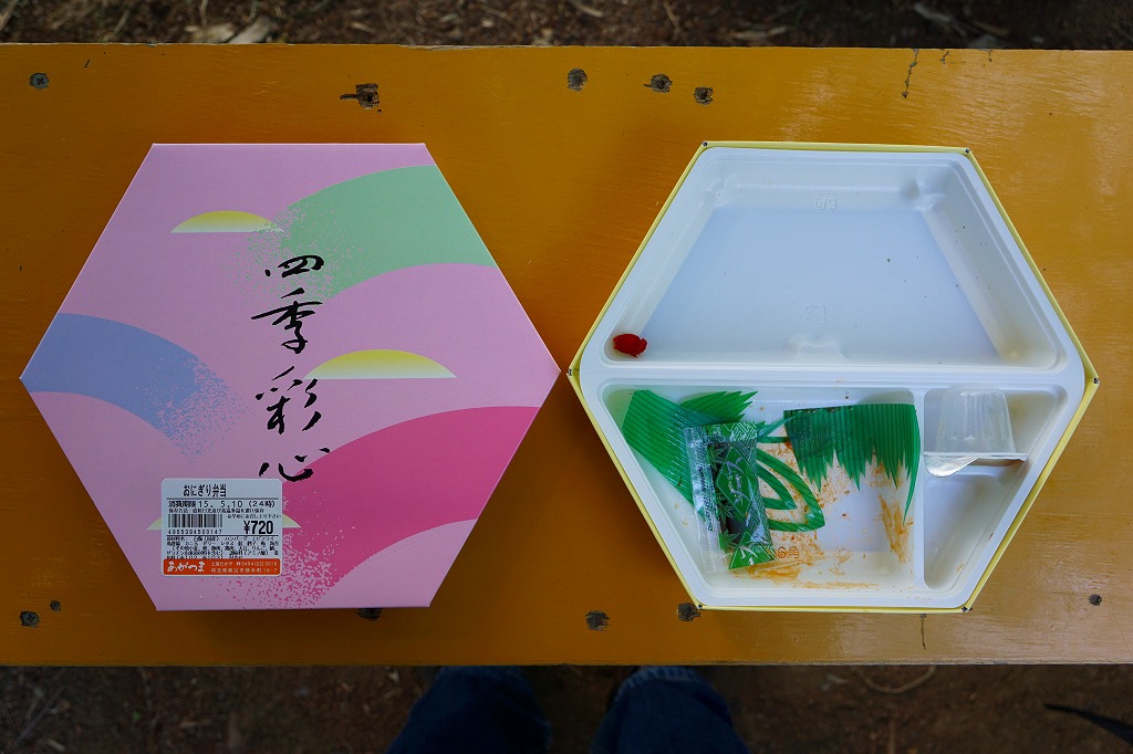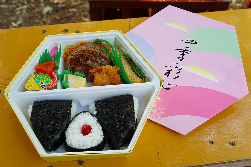 西武秩父駅で無名な駅弁のひとつ。「四季彩心」と書かれた市販の正六角形のボール紙製容器に、鮭おにぎり、たらこおにぎり、梅おにぎりを詰め、おかずとしてハンバーグ、エビフライ、鶏唐揚、玉子焼、スパゲティ、カップゼリーなどを添える。見た目は仕出し弁当風で、味はスーパーの惣菜風で、秩父とは何も関係がない中身であり、駅弁と紹介する弁当の雰囲気はない。ハイキングのお供として、ここにはこのようなお弁当の需要があるのだろう。価格は2000年代で700円、2014年4月の消費税率改定で720円。2024年に来てみたら、売店での弁当の販売がなくなっていた。
