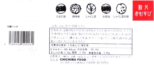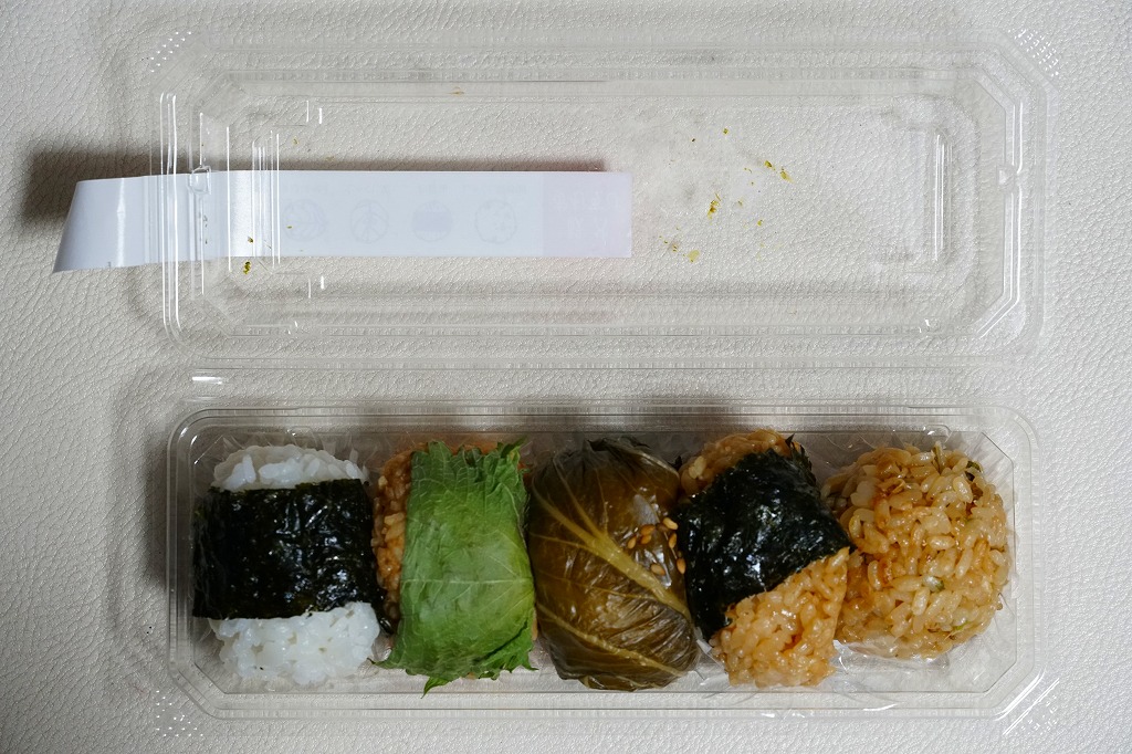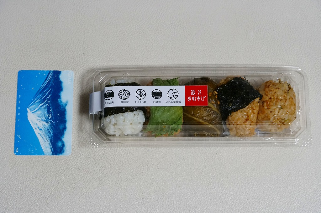 2024年に西武秩父駅で購入。ここではかつて「わらじかつ弁当」やおにぎり弁当や幕の内弁当に岩魚すしなどが売られ、リニューアル前は釜飯の駅弁も売られたが、上記のフードコート弁当を残してすべてなくなり、おにぎりやパンの販売になっていた。これはその店内に加え、通路の真ん中で客を呼んでいた商品。たまご焼、豚味噌、しゃくし菜、お醤油、しゃくし菜炒飯で5個の小さな飯球を、惣菜向けの透明プラ容器に並べ、商品名とその説明イラストを記したシールを貼る。シールでは商品名が「秩父おむすび」と読め、レシートには「おにぎり5個パック」とあった。まるで駅弁はいまどき古臭いと決別したような、土産物店のお惣菜。調製元に関する情報は発信されていない。