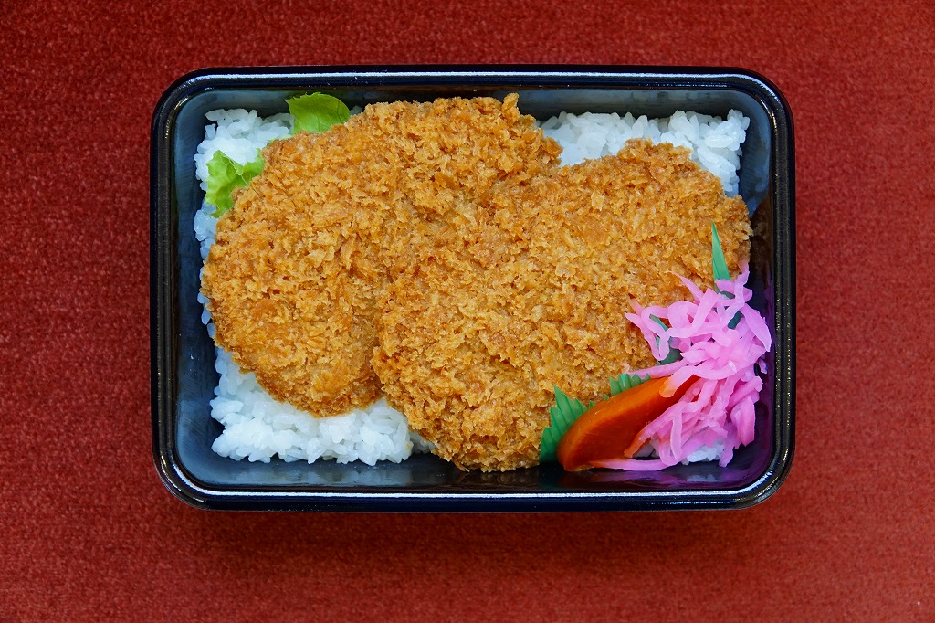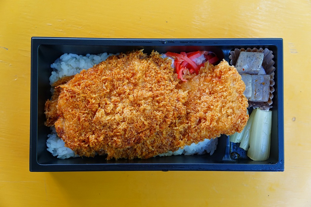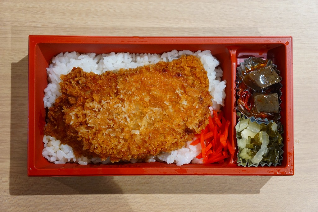 西武秩父駅で幕の内弁当やおにぎり弁当を売った調製元の、秩父名物わらじかつ弁当。弁当そのものに、名称や内容などの表示はなく、容器の見た目はまるでホカ弁。中身は白御飯にロースカツのソース漬け2枚を載せる、正しい姿のわらじかつ丼。B級グルメらしからぬ、箸で切れる柔らかいカツと整った見栄えを備えていた。