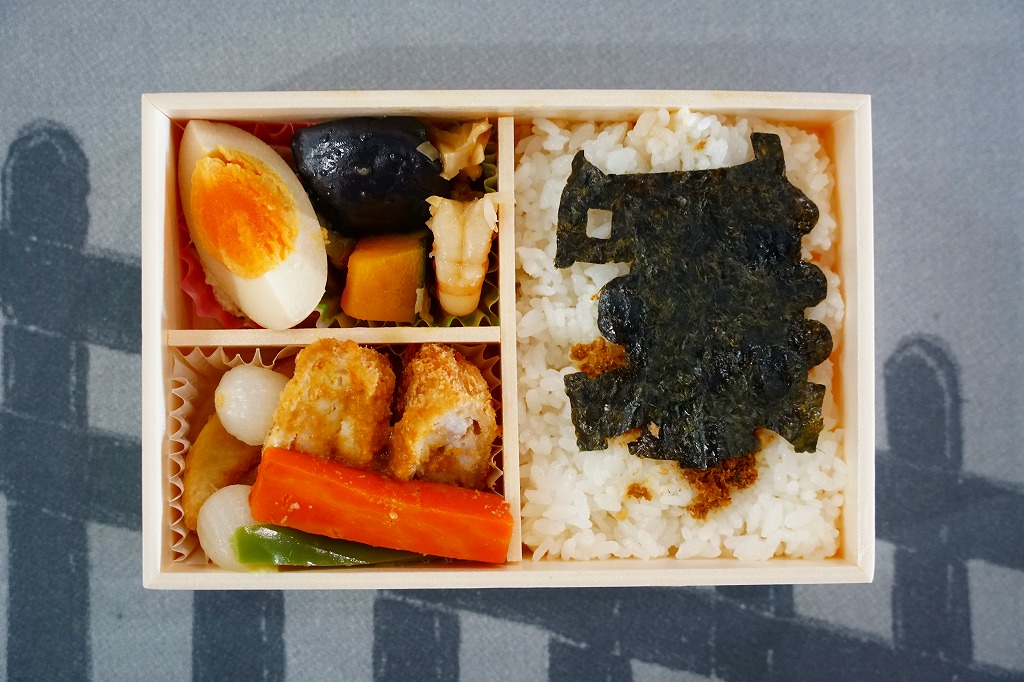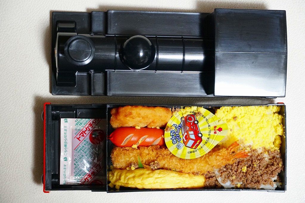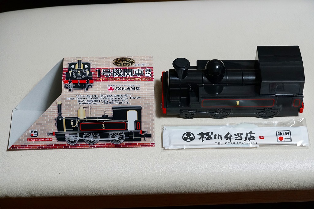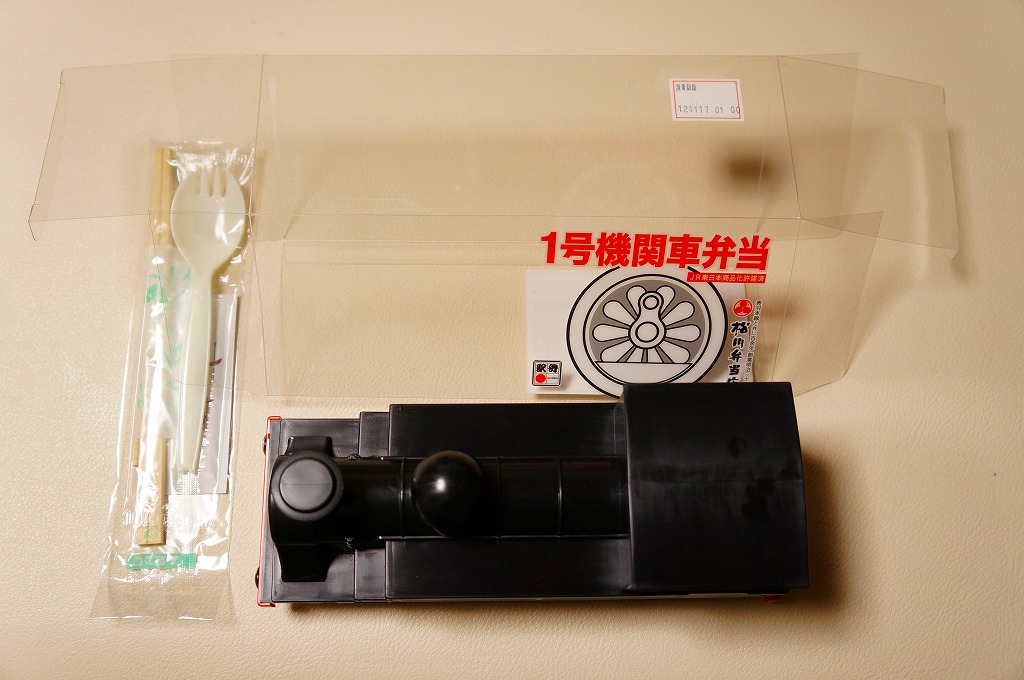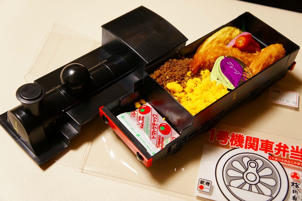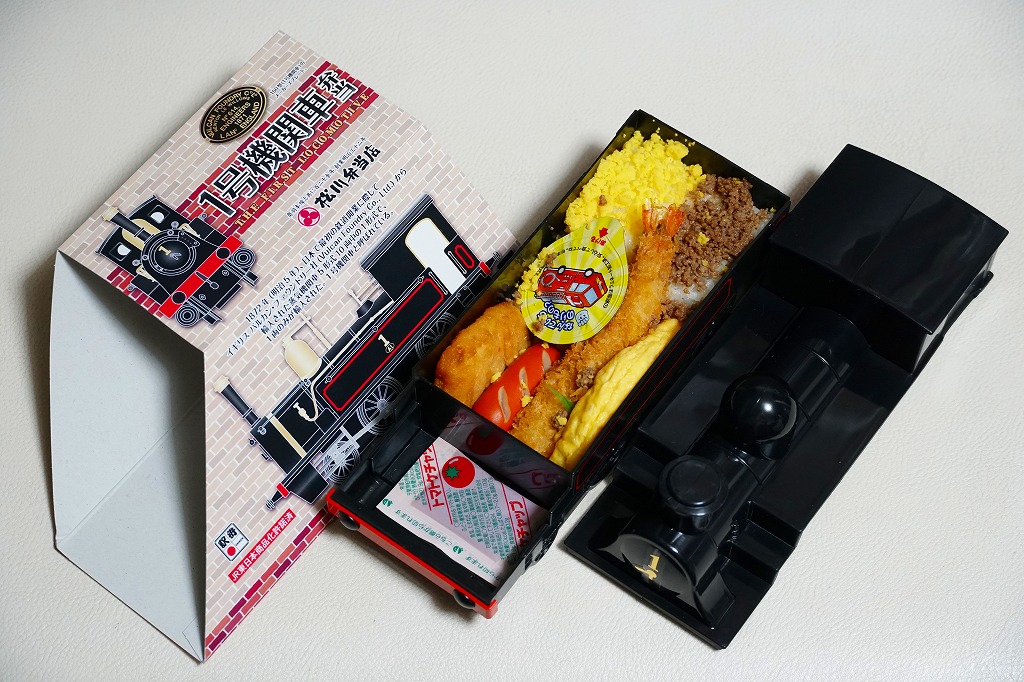 上記の駅弁「1号機関車弁当」の、2012(平成24)年の発売当時の姿。機関車の容器は2022年4月頃まで、紙のスリーブでなく透明なプラ箱に入れていた。中身も機関車の前後で具の配置が異なるが、内容は変わらない。
