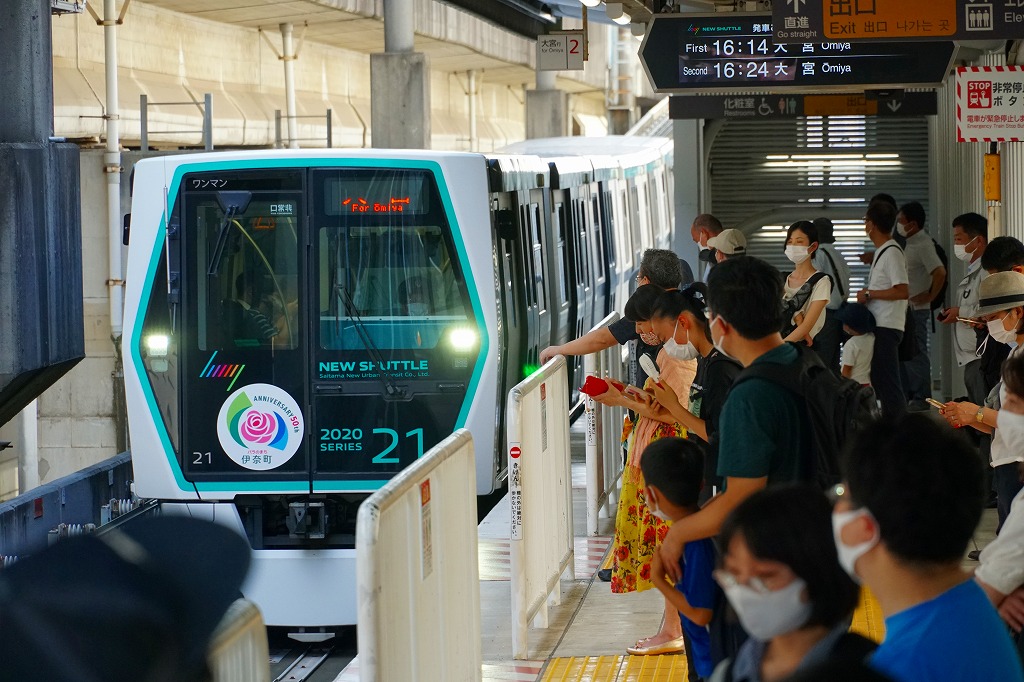 ニューシャトルは、1983(昭和58)年12月に大宮駅から羽貫駅までの間で開業、1990(平成2)年8月に内宿駅まで全通した新交通システム。ゴムタイヤで走る5両編成の電車が、上越新幹線の高架橋にぴったり寄り添う。東北・上越新幹線の建設で町域が高架橋にて3分割される、埼玉県北足立郡伊奈町への補償として、大宮駅まで行ける鉄道を国鉄が整備した。多くの利用は見込めないことから普通の鉄道でなく新交通システムを採用し、しかし他の同じような路線とは異なり自動運転でなく、運転士が運転し、駅には駅員がいる。地元以外の人が乗る路線ではなかったが、2007年の鉄道博物館の開業により、観光客も乗る路線となった。