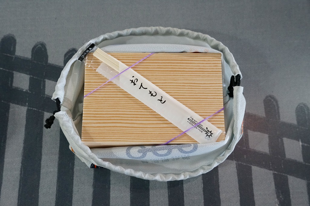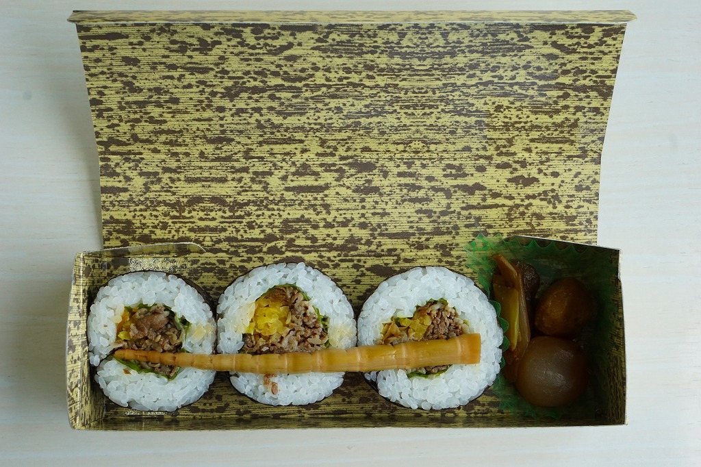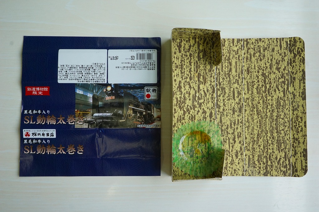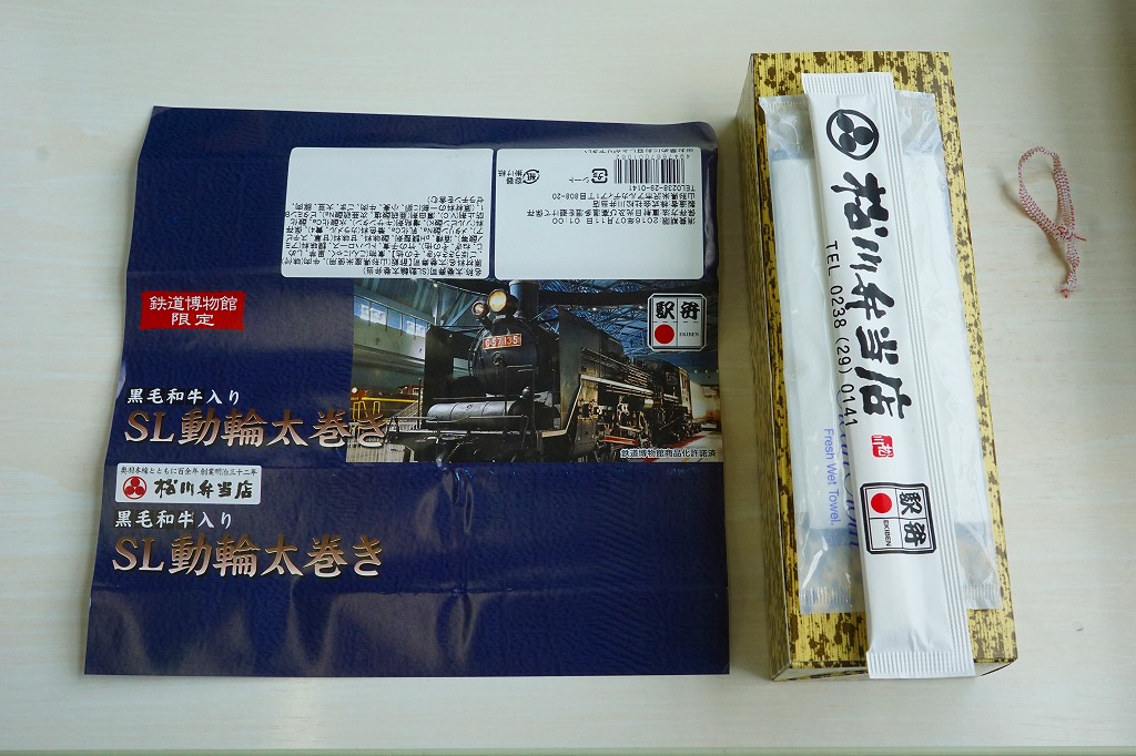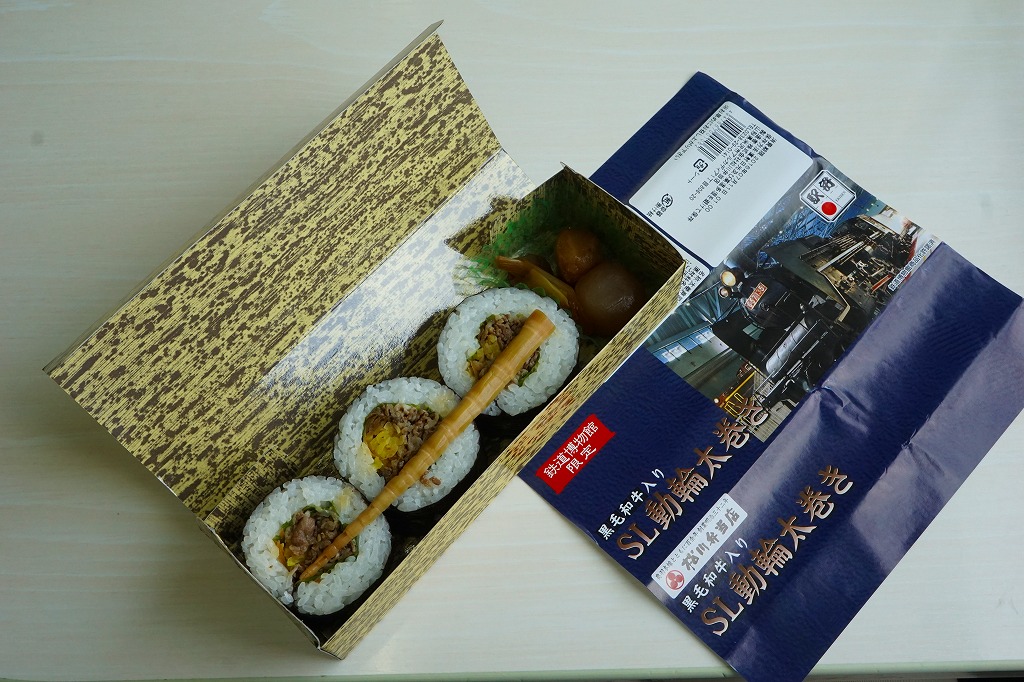 鉄道博物館の開館3周年を記念して、2010(平成22)年の秋までに発売か。調製元は、山形県は米沢駅の駅弁屋。館内展示の蒸気機関車の写真を載せる掛紙を巻いた、竹皮柄の細長いボール紙の箱に、太巻きを3個並べ、ヒメタケを置き、芋煮を添える。この太巻きとヒメタケで、SL(蒸気機関車)の動輪とロッドを表現したのだろう。実際に掛紙のC57形式蒸気機関車は、直径1.75メートルの動輪を3軸備える。これはお手軽なアイデア作。価格は2010年の発売時で500円、2016年の購入時で550円。2018年の秋頃に終売か。