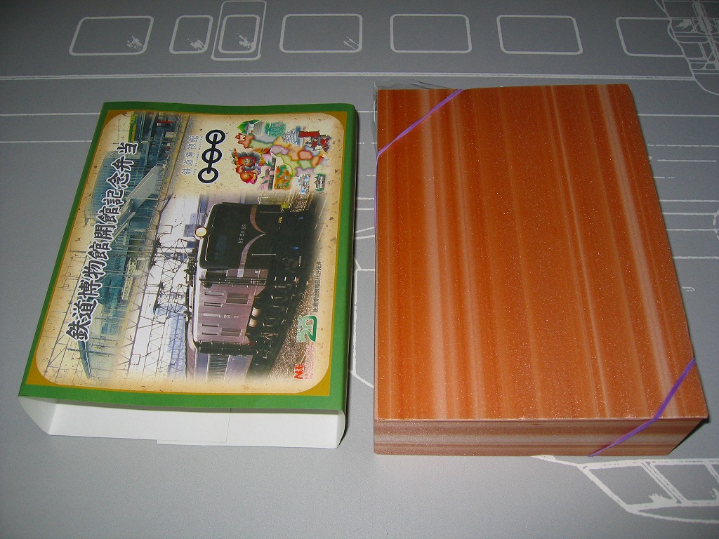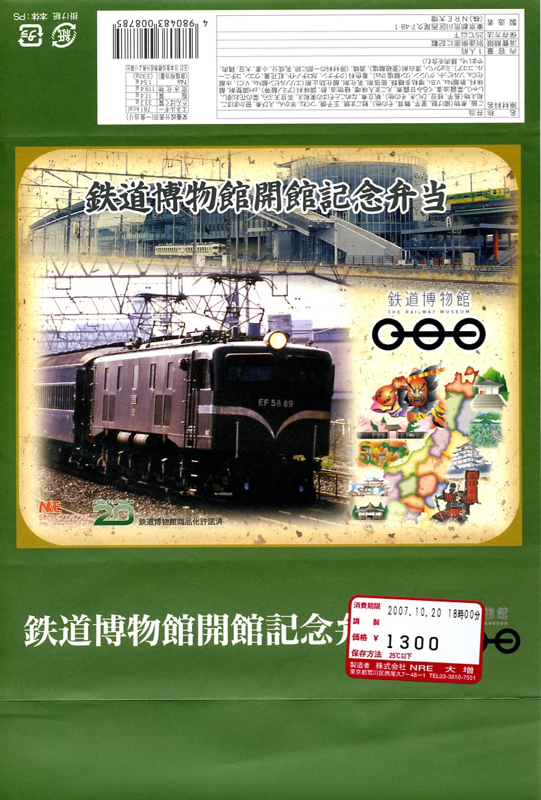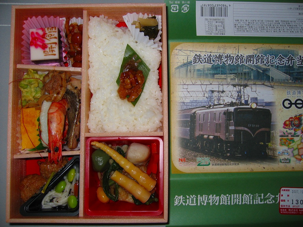 2007(平成19)年10月14日の鉄道博物館の開館とともに発売された、博物館内限定販売のお弁当。価格も内容も掛紙のデザインも、基本的には東京駅弁「東日本味の選りすぐり弁当 うまいもん」と同じもので、掛紙右下の絵柄が共通であることがヒント。掛紙に鉄道博物館や人気機関車の写真に鉄道博物館のロゴマーク等が付き、中身のずんだもちが「祝開館」のようかんに差し替えられていることが相違点。数か月間の販売か。