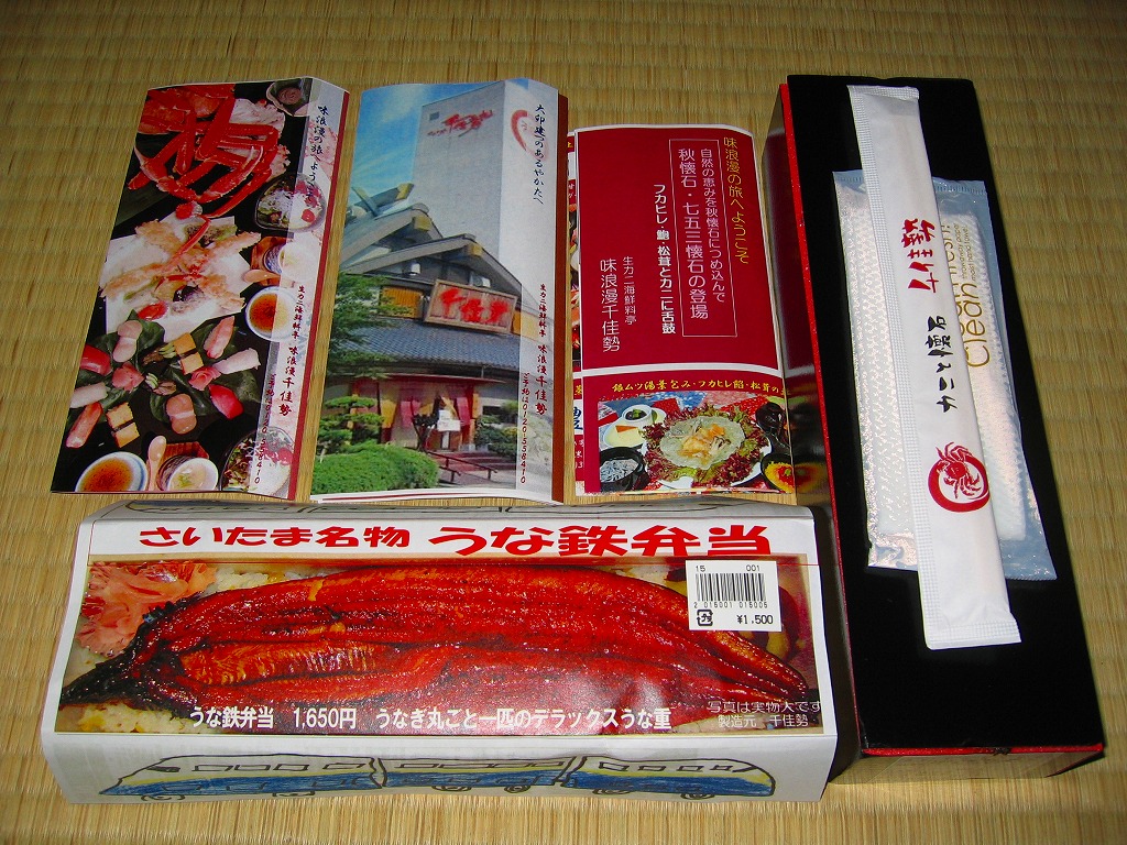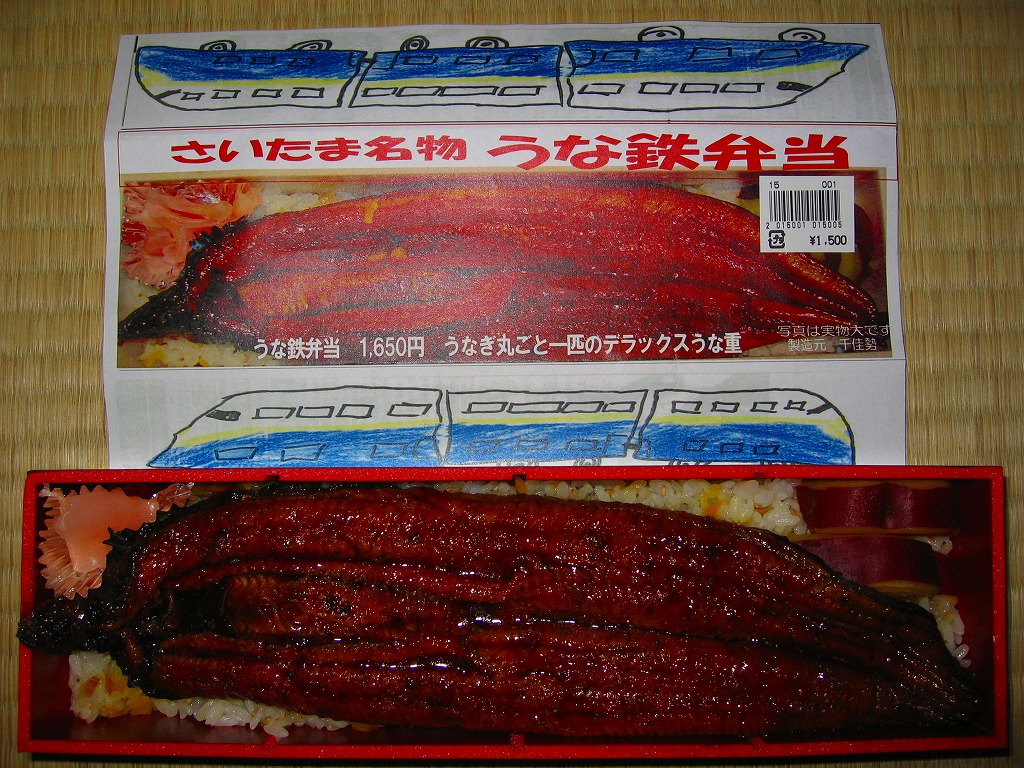 鉄道博物館の最寄り駅で売られたお弁当。黒く細長い容器に、割りばしとおしぼりといくつものチラシを置いて、中身の写真と新幹線の児童絵を描いた掛紙を巻く。中身は白ゴマと刻みタクアンを混ぜた酢飯にウナギ蒲焼を1匹載せて、甘酢生姜とサツマイモを添えるもの。掛紙には1,650円の価格が見えるが、常に1,500円で販売した模様。