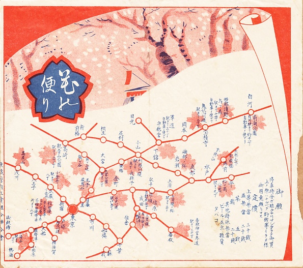 おそらく1930年代、昭和10年前後のものと思われる、昔の佐原駅弁の掛紙。おかずの掛紙には、今もこの地域の観光資源である水郷の、木舟や帆掛け舟に茅葺き屋根の家屋がある昔の風景と、「愛せよ風景 美化せよ国土」という当時の鉄道省の当選標語を記す。御飯の掛紙はおそらく各社共通で、花便りとして鉄道省の東京鉄道局管内の梅や桜の名所の一部を路線図で示す。佐原駅の駅弁は第二次大戦後に残らなかったようだ。