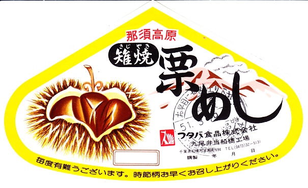 1976(昭和51)年3月19日の調製と思われる、弁当の掛紙。調製元は黒磯駅の駅弁屋で、商品は1975年頃から2005年の駅弁撤退まで黒磯駅などで売られた、栗型の容器に茶飯を詰めて、鶏肉や栗や山菜などで覆ったお弁当だった。しかし調製元の所在地が千葉県船橋市とある。当時のフタバ食品は栃木県外の東京やその近郊でも弁当を調製し販売していたようで、平成時代にも東武浅草駅の駅弁屋と紹介された。東武船橋駅にも弁当売店があったので、そこでも売られたのではないだろうか。商品そのものは「那須高原」を名乗るくらいなので、黒磯駅の駅弁と同じだったのだろう。当時の価格は500円か。