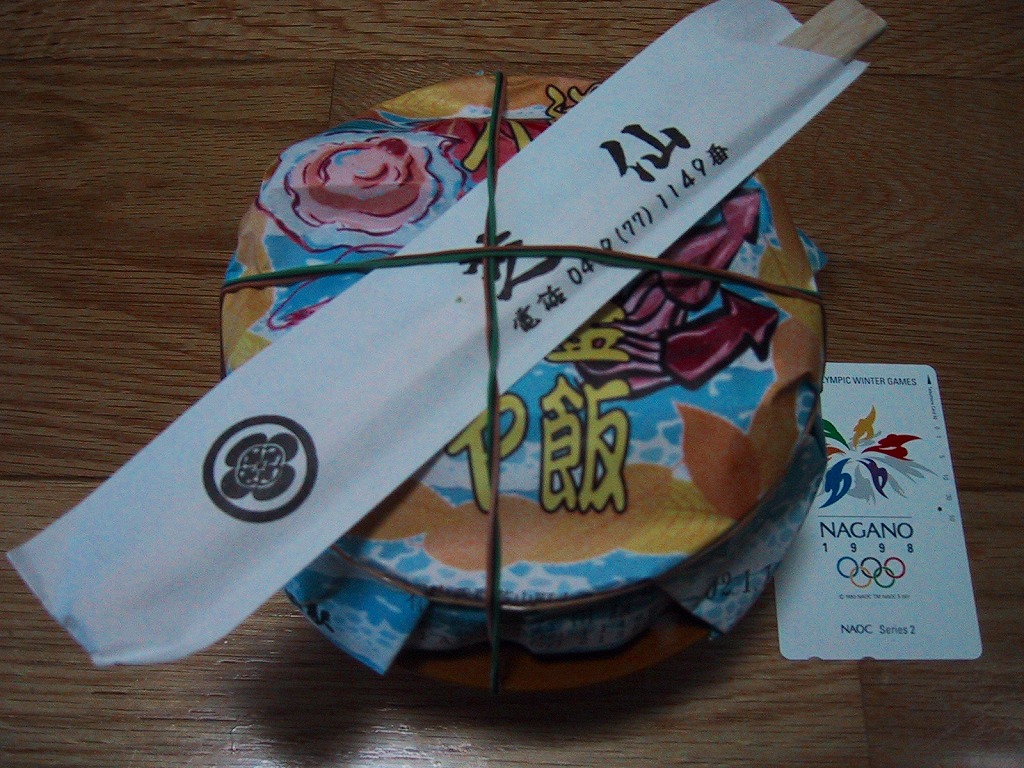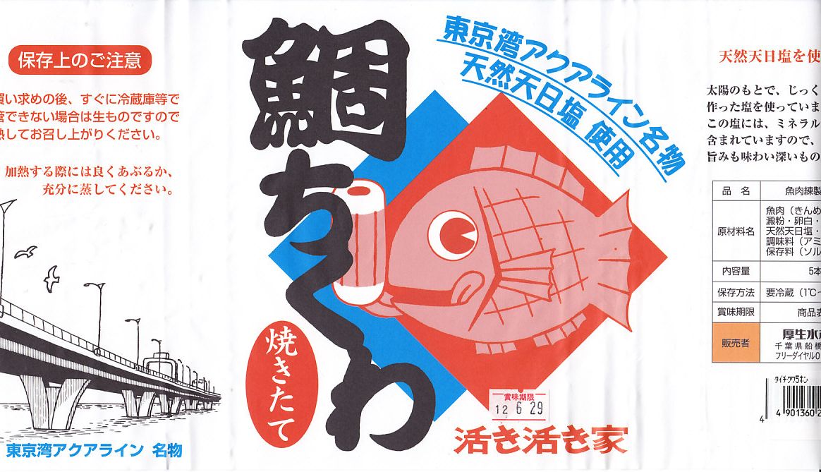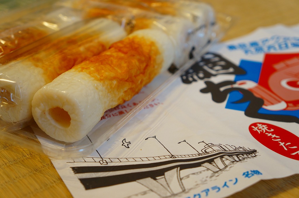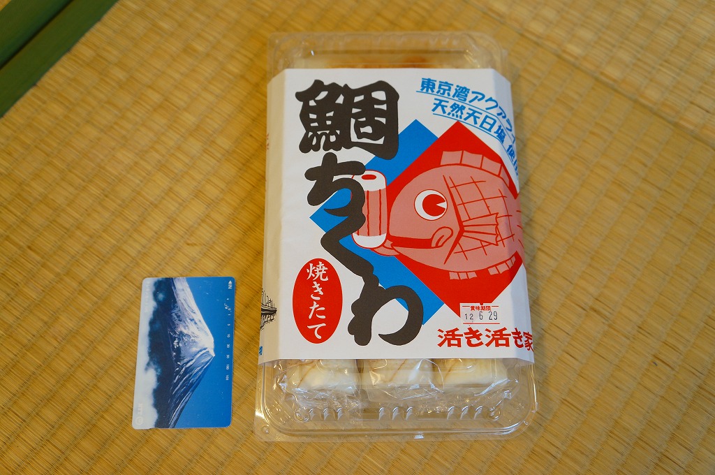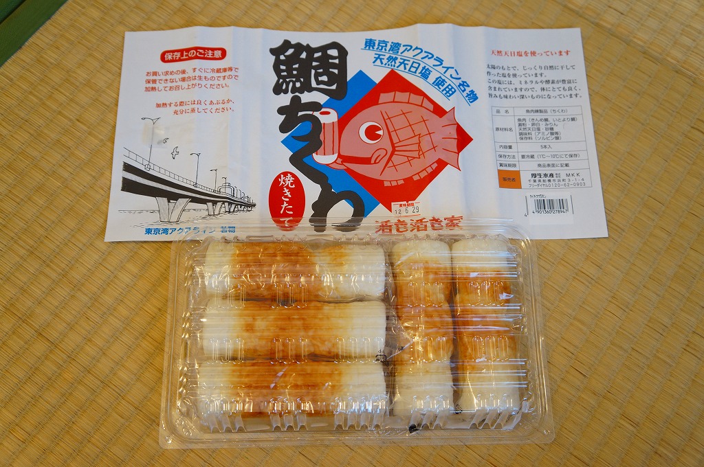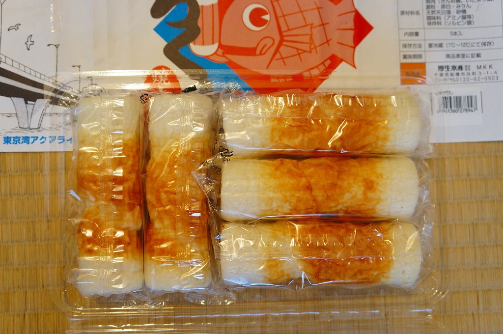 これは駅弁ではなく、東京湾アクアラインの海ほたるパーキングエリアの観光売店で売られていた土産品。キンメダイとイトヨリダイと天然天日塩を使ったという個別包装された太めの竹輪が5本、縦と横に向きを変えて整然と詰められる。駅弁に似たデザインの掛紙を使っていたから買ってみた。おいしくいただけた。