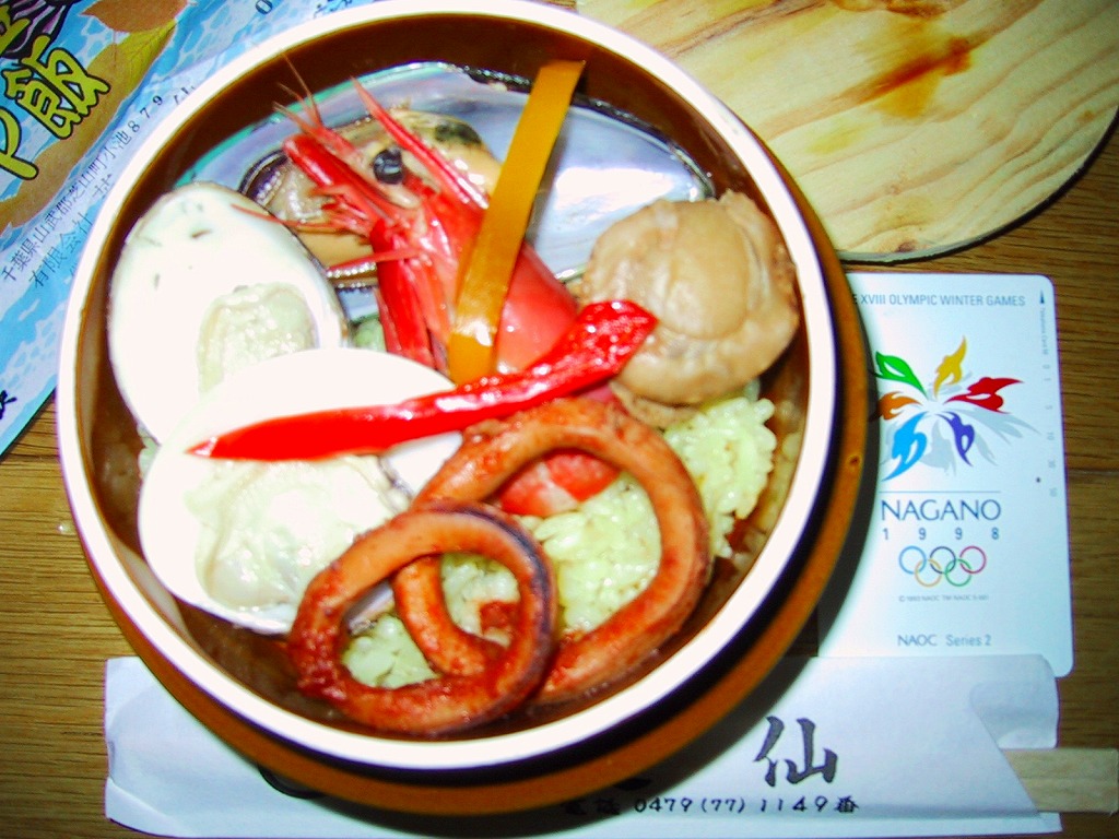 木のふたをかけた陶製の釜容器を使用、中身はサフランライスの上にエビ・イカリング・ホタテにムール貝を載せた、スペインの家庭料理「パエリヤ」の釜飯駅弁。