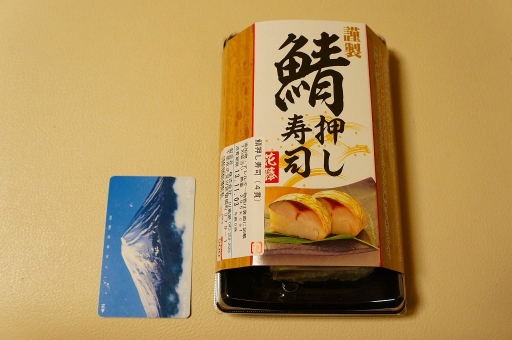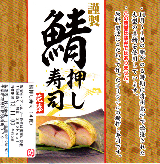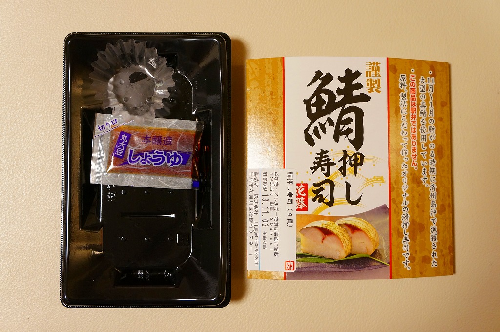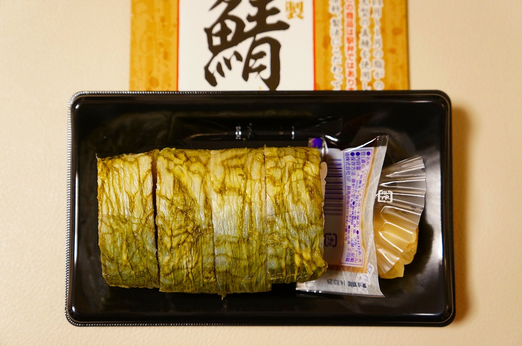 酢飯と焼かない締めサバを貼り合わせて昆布で巻いた棒寿司を、惣菜向けプラ製トレーに4カット分並べ、ガリと醤油も詰めてボール紙の枠にはめる。スーパーでの駅弁催事で「この商品は駅弁ではありません」と赤い文字で明記して販売するという、なぜここにあるのか、そんなことをするのか不思議な商品。味は同じような駅弁と、あまり変わらない。調製元は千葉市内のパン屋さん。