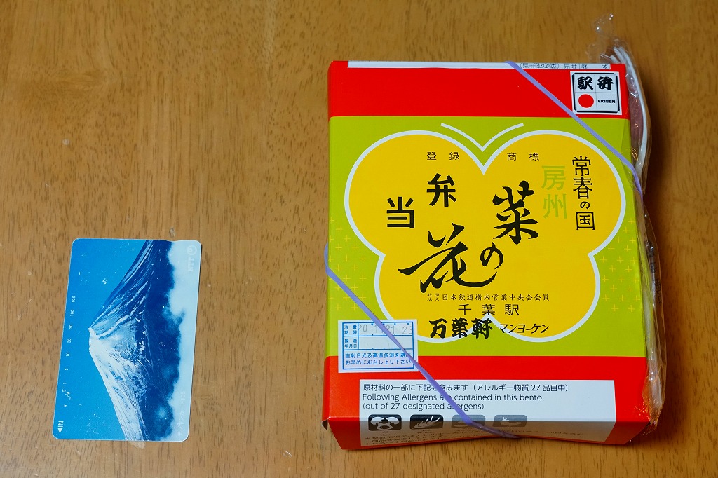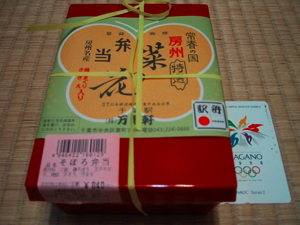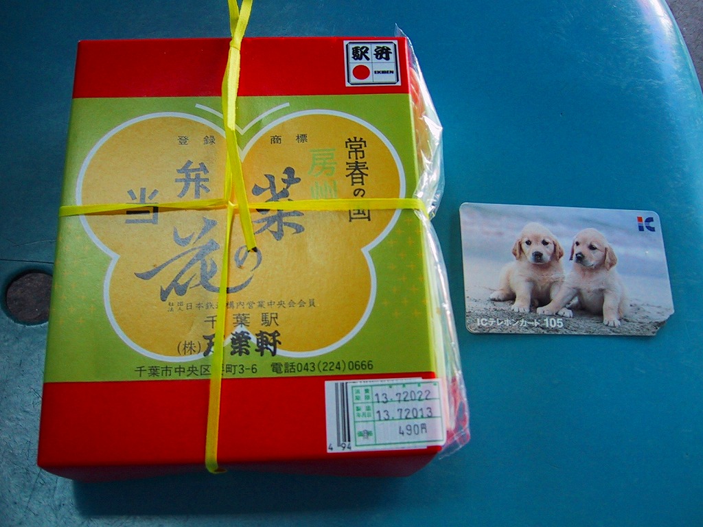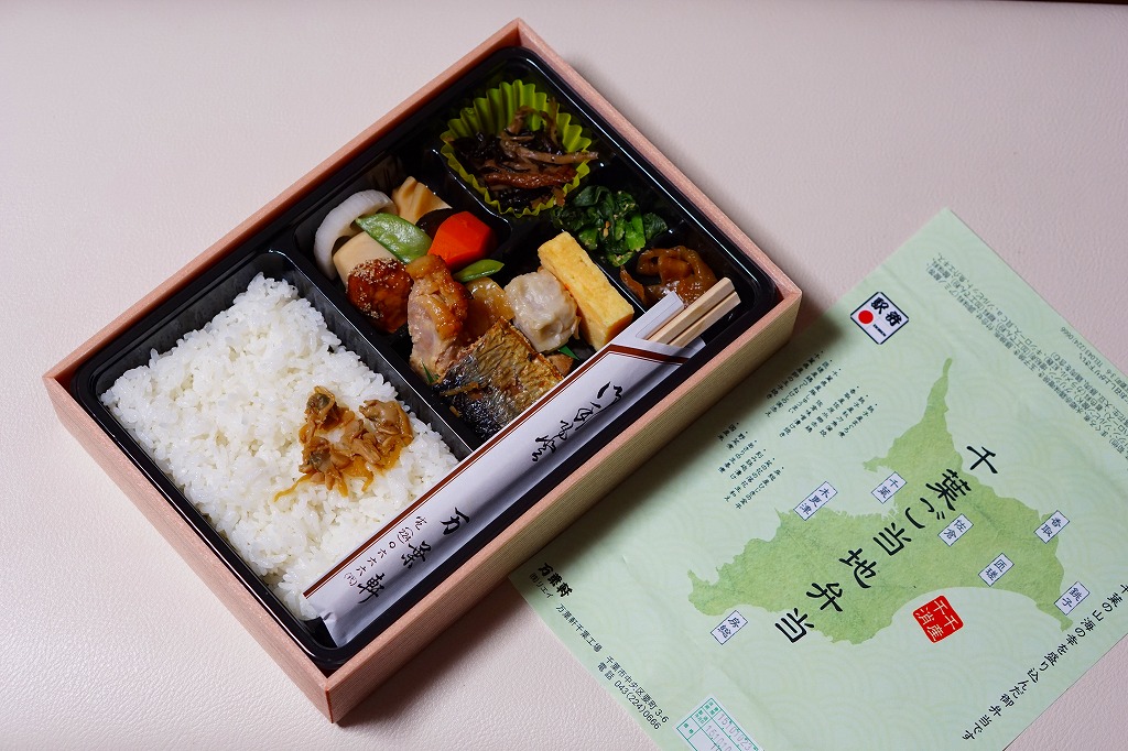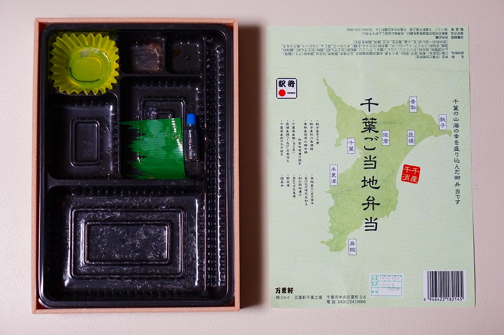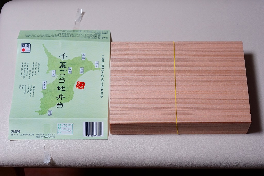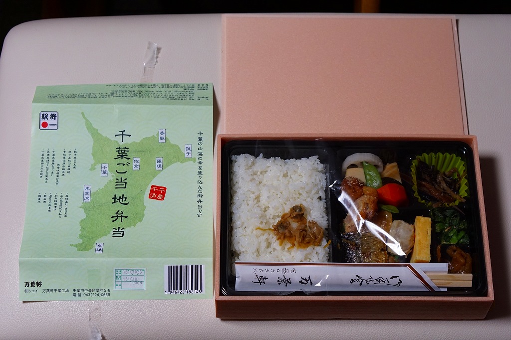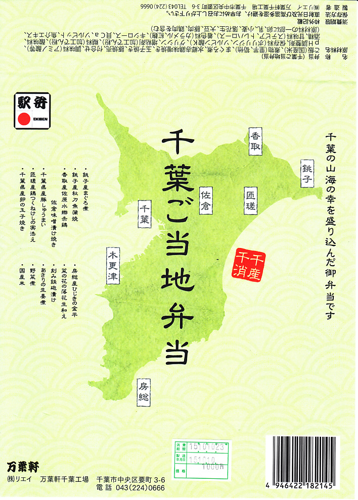2014(平成26)年9月までに発売か。千葉県土のシルエットに地名やおしながきを書いた緑色の掛紙を使う。中身は幕の内タイプで、白御飯の上にはアサリ生姜煮が載り、おかずのマグロ煮とサンマ蒲焼は銚子産、鶏味噌漬焼は香取産、しゅうまいと玉子焼は千葉県産、鶏つくねは匝瑳(そうさ)産、ひじきは房総産など。そんな感じで、掛紙のおしながきによると、それぞれが千葉の山海の幸だそうな。とはいえ、駅弁大会に出てくるタイプでない、味も中身も弁当として実用的な千葉満載。2020年の春頃に、ひっそりと終売か。