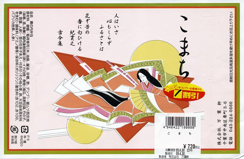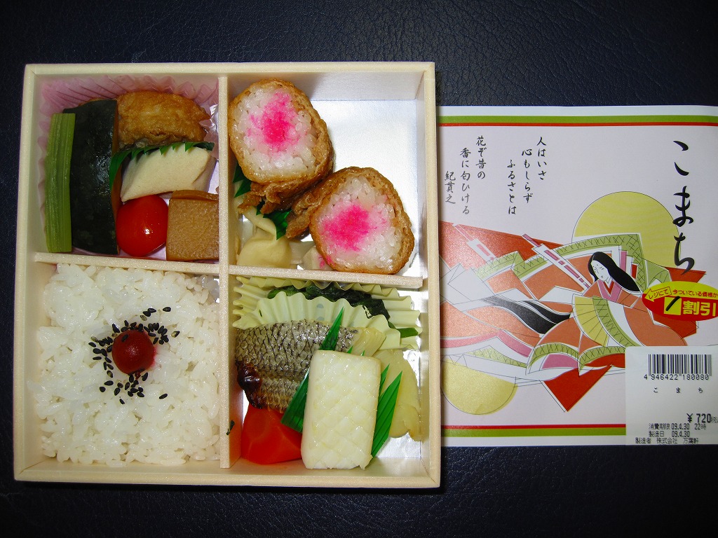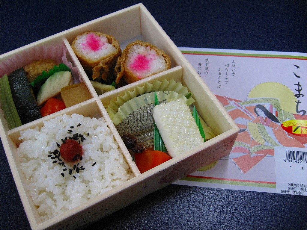 千葉駅の女性向け駅弁だそうな。小さな正方形の容器に、紫式部や柿本人麻呂の和歌が記される同じ素材のふたをして、紀貫之の歌と小野小町のイラストを描いた掛紙をかけて、桃色のひもでしばる。松花堂タイプに区画された中身はそれぞれ、日の丸御飯、カボチャや高野豆腐などの煮物と鶏肉レンコン挟み揚げ、半身のおいなりさん2個、銀ムツ西京焼とイカ白焼と菜の花和えなど。