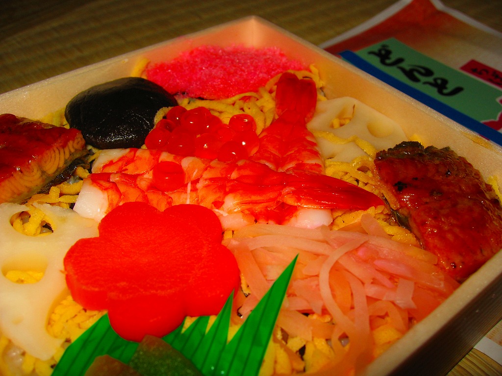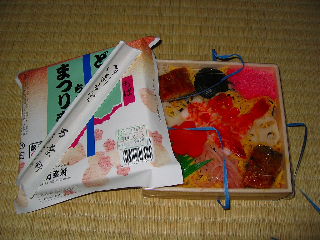岡山で有名な駅弁の、千葉駅版という感じ。小さく浅い正方形の容器に透明なふたをして、掛紙をかけて割り箸とともに紙ひもでしばる。中身はかんぴょう混じりの酢飯の上に刻み海苔と錦糸卵を敷き、ウナギ、エビ、椎茸、イクラもどき、レンコン、人参、紅生姜など。