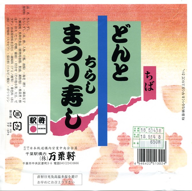 2001(平成13)年7月20日に購入した、千葉駅弁のふた。デザインは当時も上記の2015年のものも、昭和の頃から変わらない。食品表示と調製元の表記には変化がある。