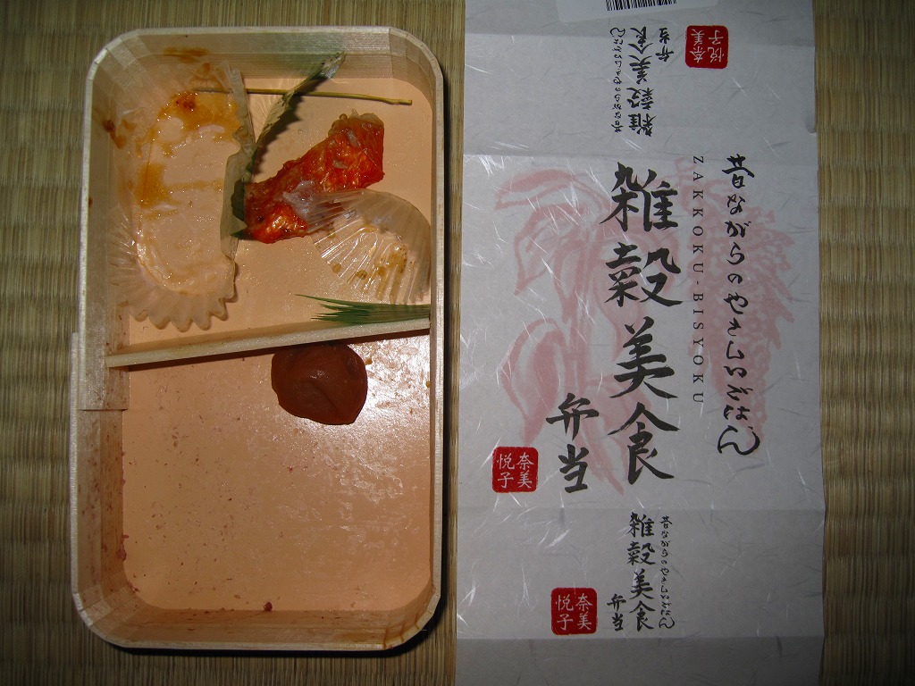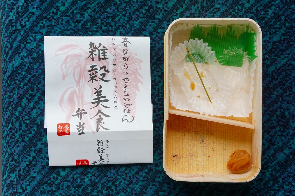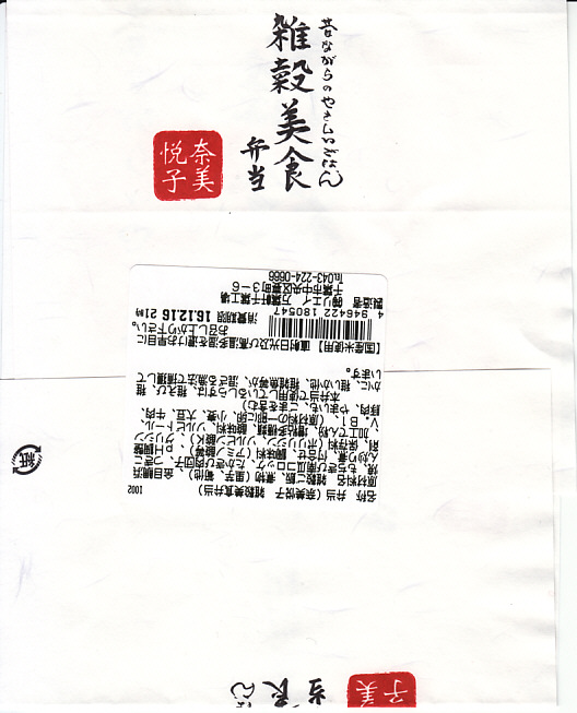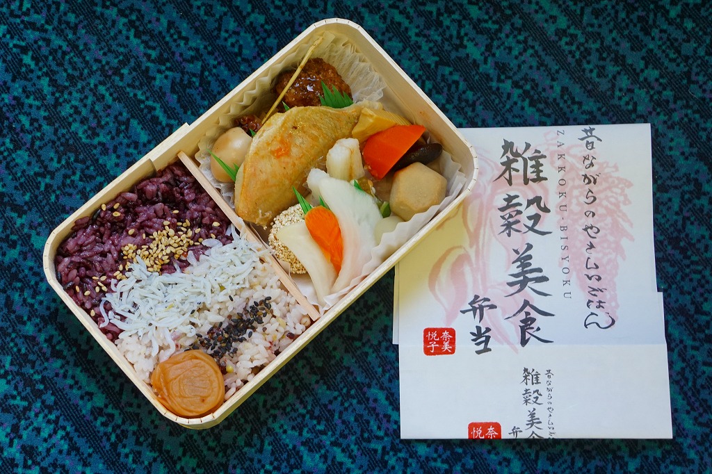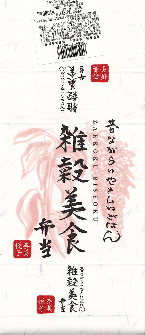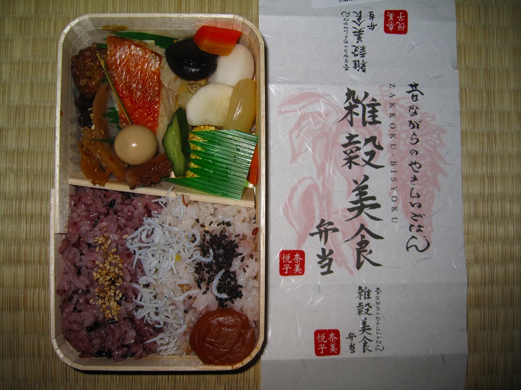 女優で「雑穀アドバイザー」を名乗る奈美悦子氏の監修により、2010(平成22)年10月1日に発売。経木枠の小柄な容器に、商品名を墨字書きした掛紙を巻く。中身は朱色の紙のお品書きにたくさん書かれるとおり、シラスとゴマをかけた監修者ブレンドの雑穀米「健康で美人」と黒米と南高梅、キンメダイ浜焼き、肉団子、かぼちゃコロッケ、タコとウズラ卵の串、タケノコやサトイモなどの煮物、レンコンきんぴらなど。