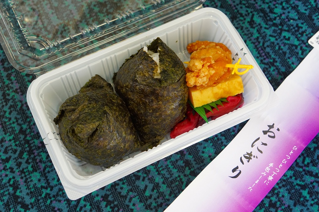 千葉駅に唯一残った駅弁売店で買えた、駅弁屋が作るおむすび。小ぶりな梅と昆布のおにぎり各1個と鶏唐揚、玉子焼、柴漬けをプラ容器に詰め、商品名を書き駅弁マークのない紙帯を締めていた。