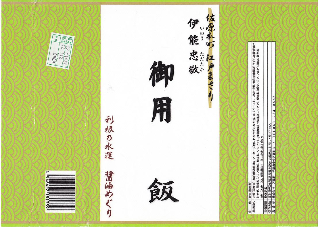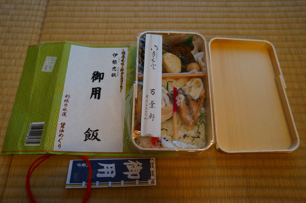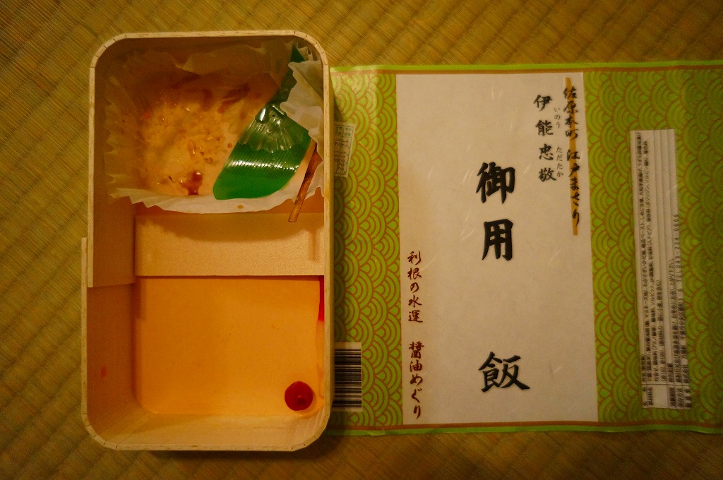 2012(平成24)年1月の京王百貨店の駅弁大会で輸送販売されたお弁当。他の千葉駅弁でも見掛ける細身な長方形の木製枠の容器に、和紙風の掛紙を巻いてゴムで留め、伊能忠敬が測量時に用いた「御用旗」を模したしおりをセロハンテープで貼り付ける。