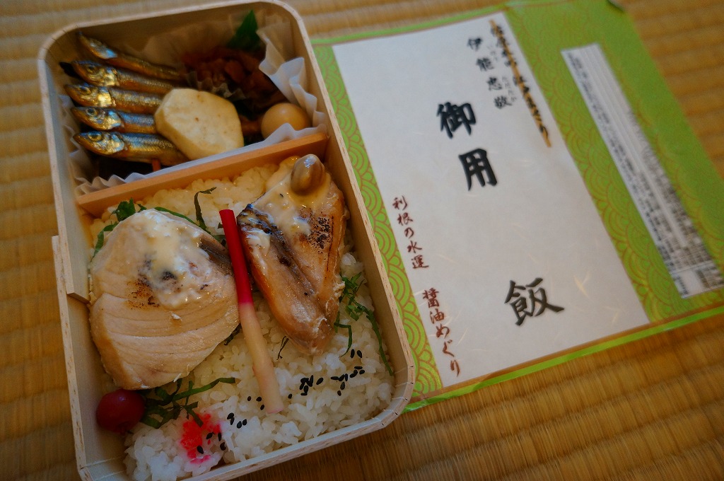 中身は白御飯の上にマヨネーズをかけた銚子マグロのもろみ網焼き(白醤油焼)を2切れ貼り、はじかみや梅干しなどで彩り、佐原イカダ焼(ワカサギ)、佐原香取の南瓜金時(かぼちゃのペースト)、香取のウズラ(卵)醤油漬やヤマトイモ(素揚げ)や芋ようかんやイモ茎佃煮、シメジ甘煮、野田おり漬など。佐原と醤油と伊能忠敬をテーマにした造り込みの深さがとても印象で、今回の京王では最も良かった。しかしこれは京王百貨店駅弁大会の専用商品であった模様。