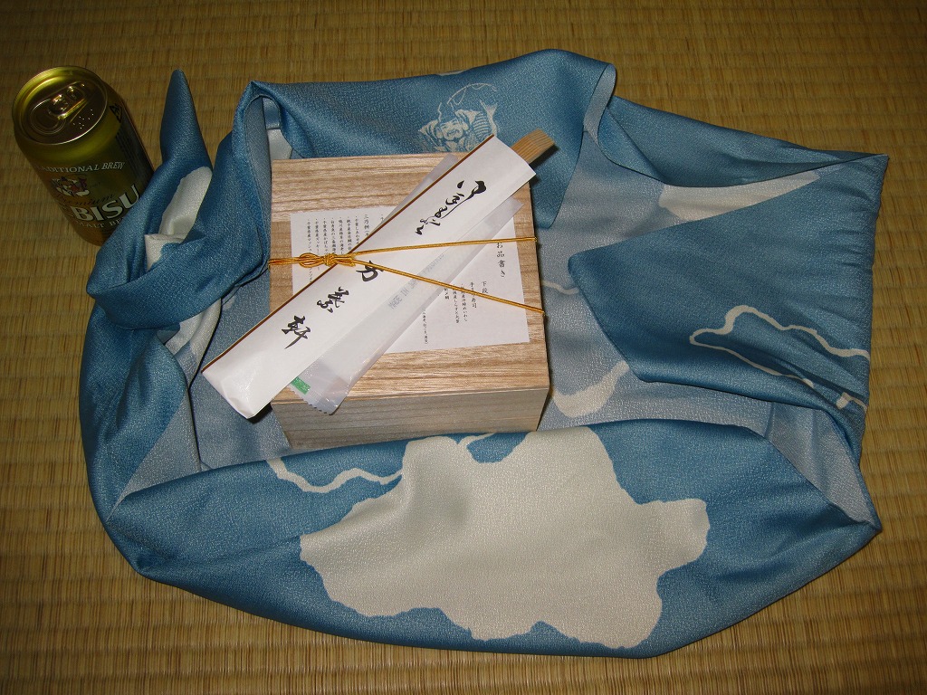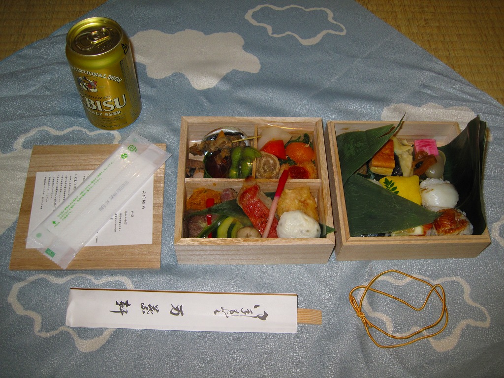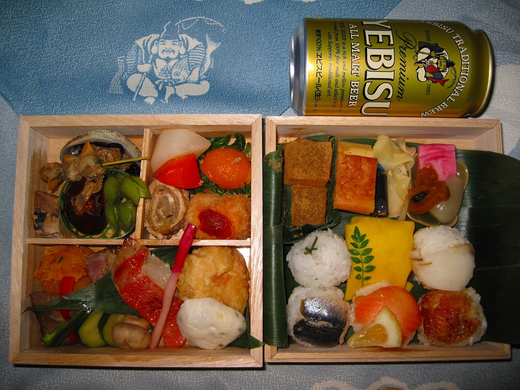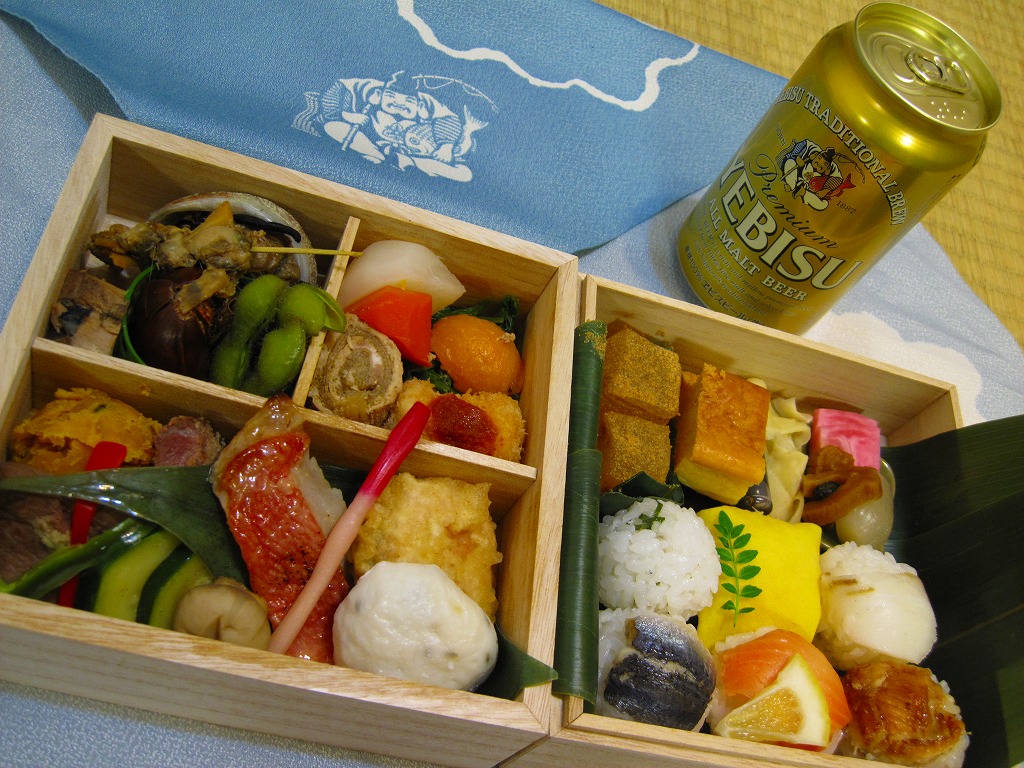 サッポロビールの企画により、2009(平成21)年7月18日から8月2日まで、東京、千葉、木更津の各駅で合計1,000個が販売された駅弁。標記の駅弁大会で早くも復刻販売が実施された。えびす様が描かれた空色の風呂敷で、正方形の二段重ねの木製容器を包む。中身は次のとおり。ヱビスビールの350ml缶も付いてきた。