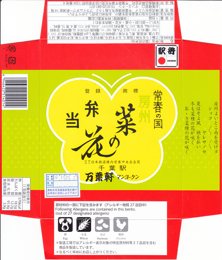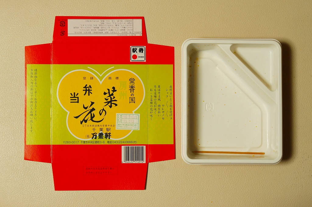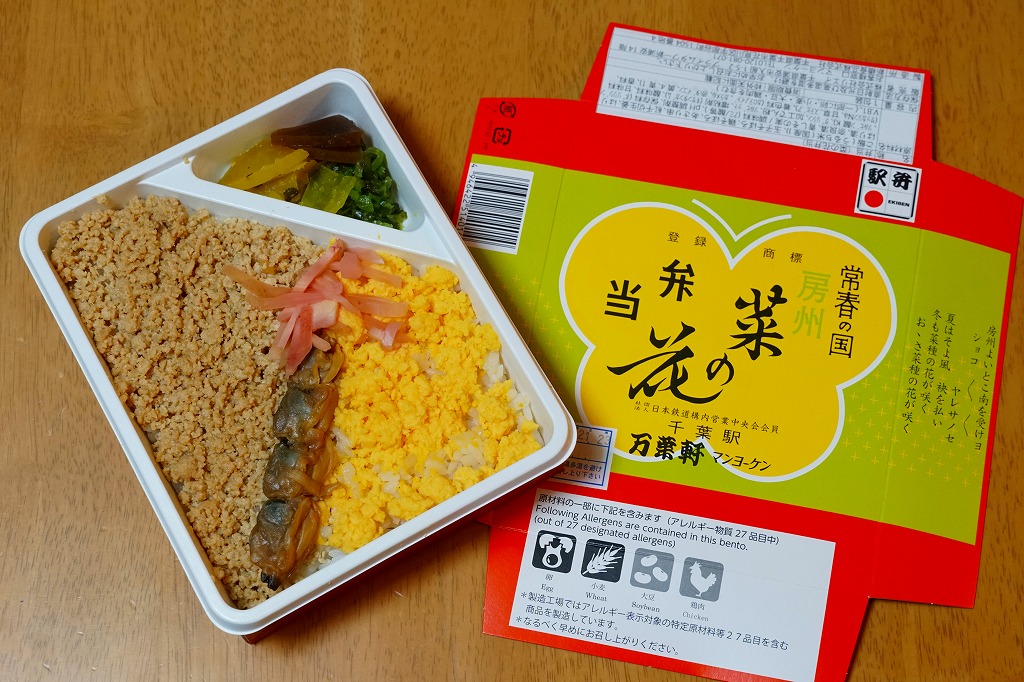 1966(昭和41)年の発売。とても小さな長方形の容器の中に白飯が敷かれ、その上に菜の花畑を卵そぼろで、畑の土を鶏そぼろで表現。仕切りにハマグリの串焼きを1本配置するのは蝶々なのだそうで、ふたの絵柄にもそれが見られる。房総の春をイメージするが、春に限らず通年の販売。価格は2001年の購入時で490円、後に520円、2007年12月から550円、2015年時点で600円、2015年7月から650円、2020年7月15日から700円、2022年4月16日から750円、2023年1月から800円、6月16日から880円、2025年2月20日から940円。10月から「消費者物価指数に連動した「時価販売」」として、3か月ごとに価格を見直すといい、まずは971円で販売。