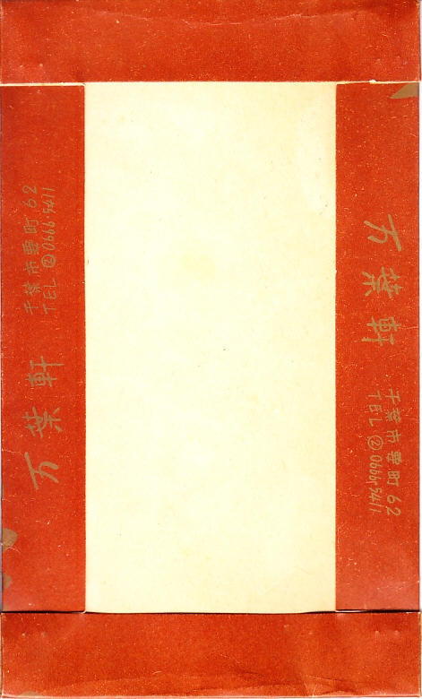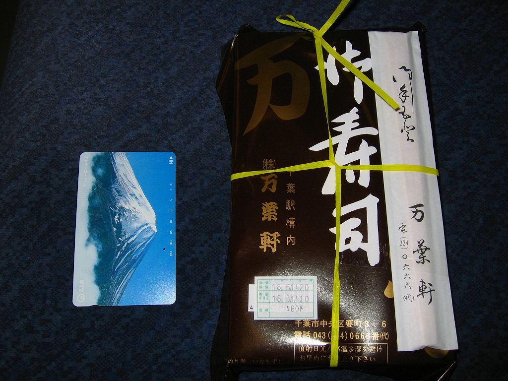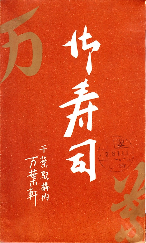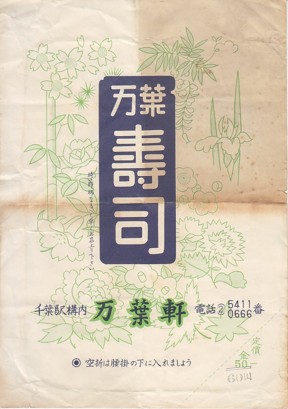 1960年代のものと思われる、昔の千葉駅弁の掛紙。復刻版として現存する万葉寿司、つまり助六寿司の掛紙だろう。千葉の十倍で万葉軒だから万葉寿司。今の介護会社のものになる前の万葉軒の駅弁紹介では、社名や駅弁の由来を万葉集でないとしていた。