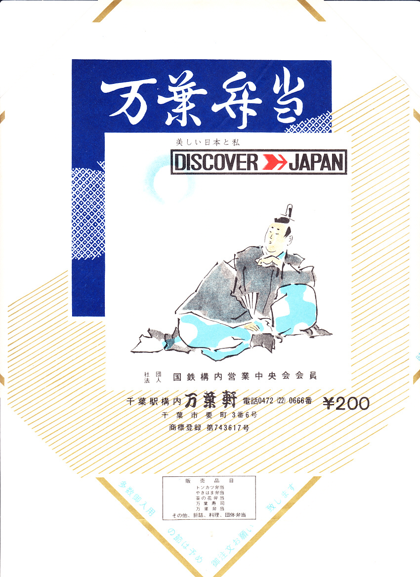 1970年代のものと思われる、昔の千葉駅弁の掛紙。200円の価格から、1972年までのものか。この殿様はいったい誰なのか。この万葉弁当は当時も現在も幕の内弁当であるが、1970年代の資料では普通弁当でなく特殊弁当の分類で紹介されている。