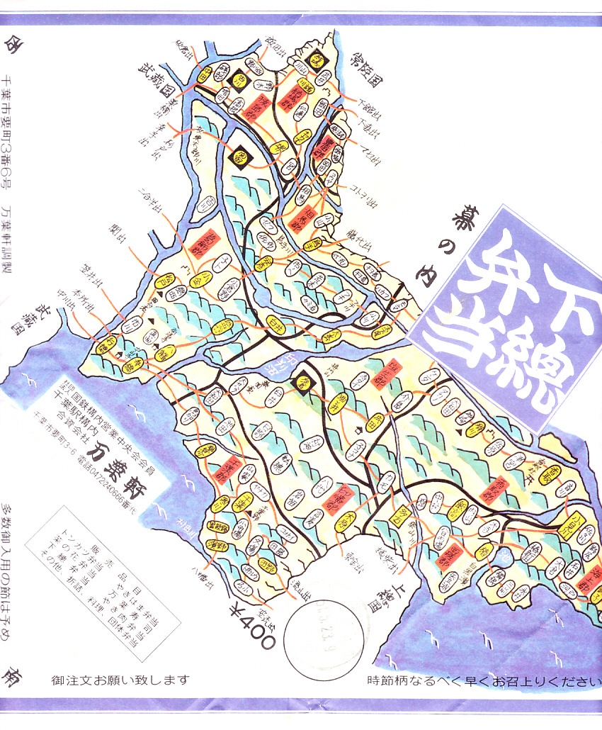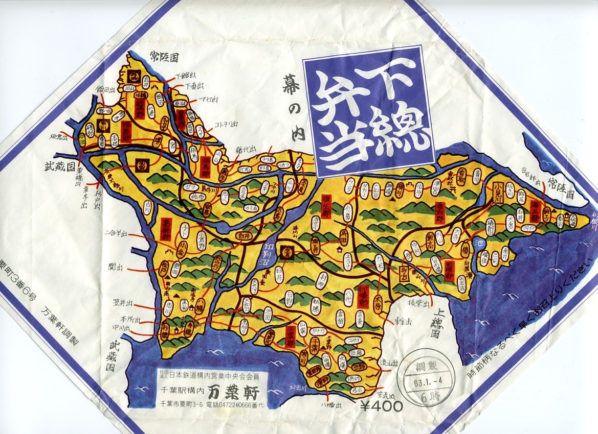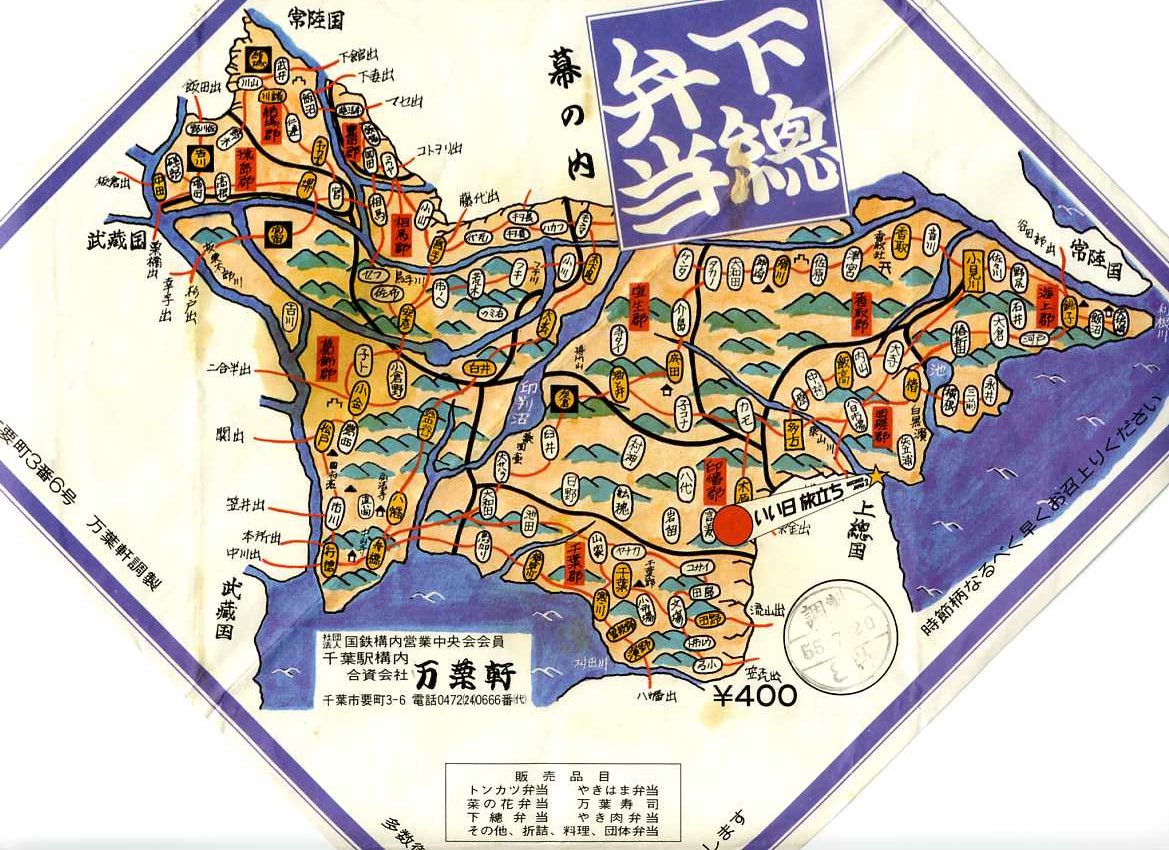 1980(昭和55)年7月20日8時の調製と思われる、昔の千葉駅弁の掛紙。旧国名で上総と下総に分けられる千葉県のうち、下総を古地図風に描く。この地図が語るとおり、江戸を水害から守るために利根川が銚子に向けられて以降、千葉県は本土と陸続きでない。