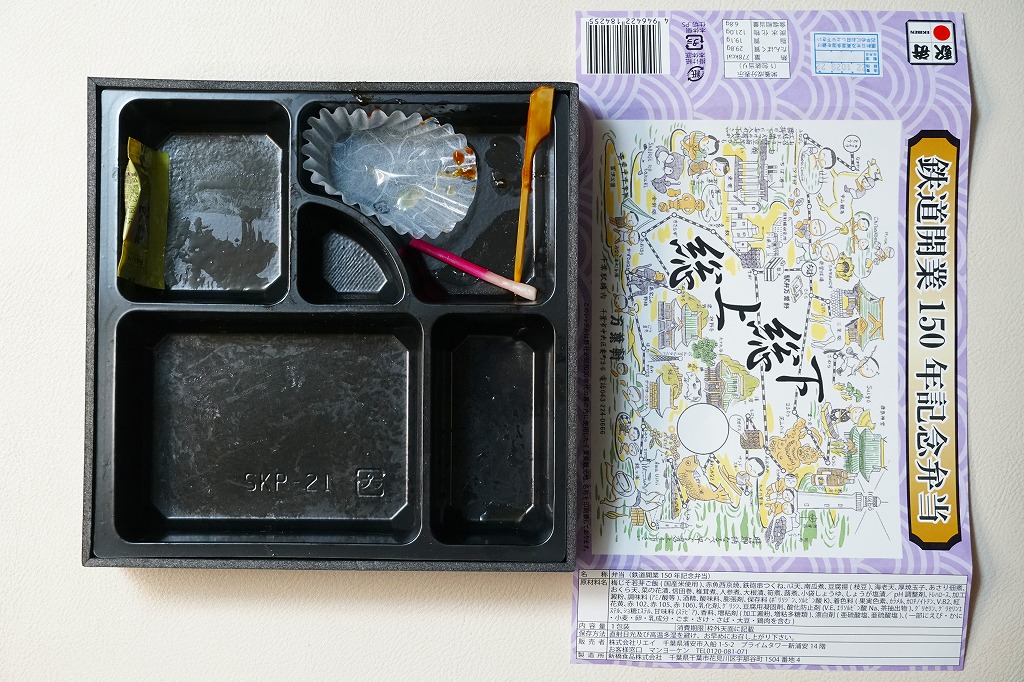 中身は梅じそ若芽ご飯、赤魚西京焼、鉄砲串つくね、ハス天、南瓜煮、豆腐揚、海老天、厚焼玉子、あさり佃煮、おくら天、菜の花漬、信田巻、椎茸煮、人参煮、大根漬、筍煮、蕗煮、生姜塩漬。この中身は千葉か昭和30年代か鉄道150年か、何かにちなんだのだろうか。現存する千葉駅弁の倍額となる、幕の内弁当タイプの記念駅弁。