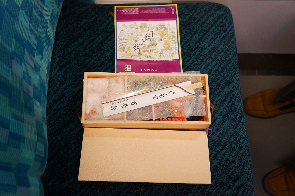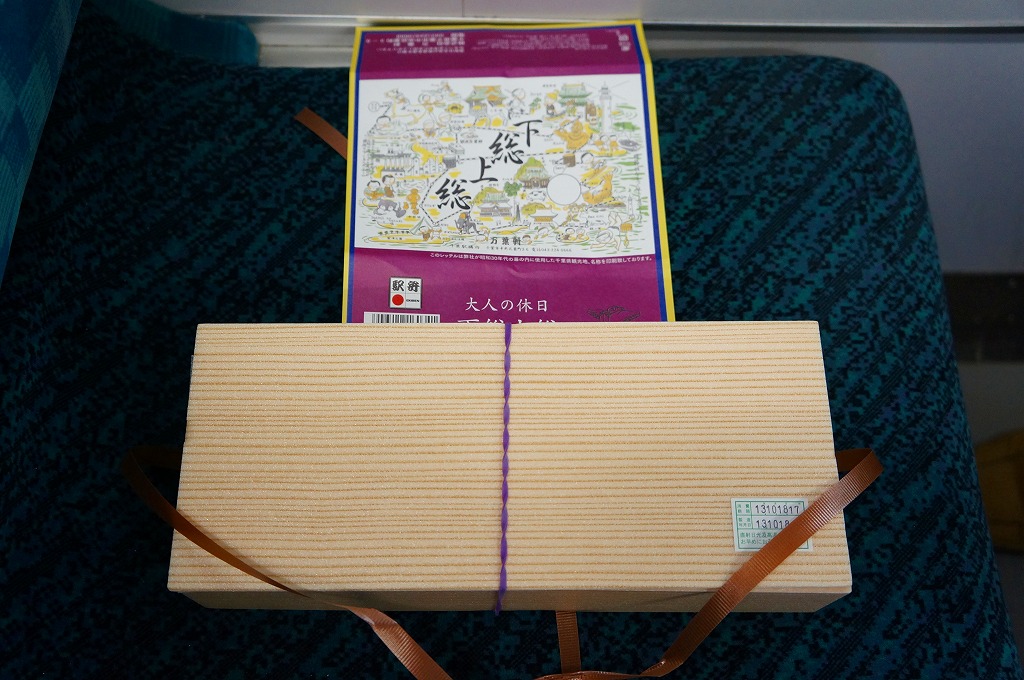 中身は桜海老の型押し俵飯に、鯛の佐倉味噌焼、マグロの竜田揚、落花生田楽、イワシの酢締めなど、下総上総をイメージした食材を詰める。大人の休日のコンセプトに従い、見た目も風味も千葉駅弁らしからぬ高級感が演じられる。予約制駅弁と案内されるが、現地に行けばけっこう置いてあるらしい。価格は2005年の購入時や下記の2013年時点で1,000円、2015年時点で1,100円。2015年頃までの販売か。