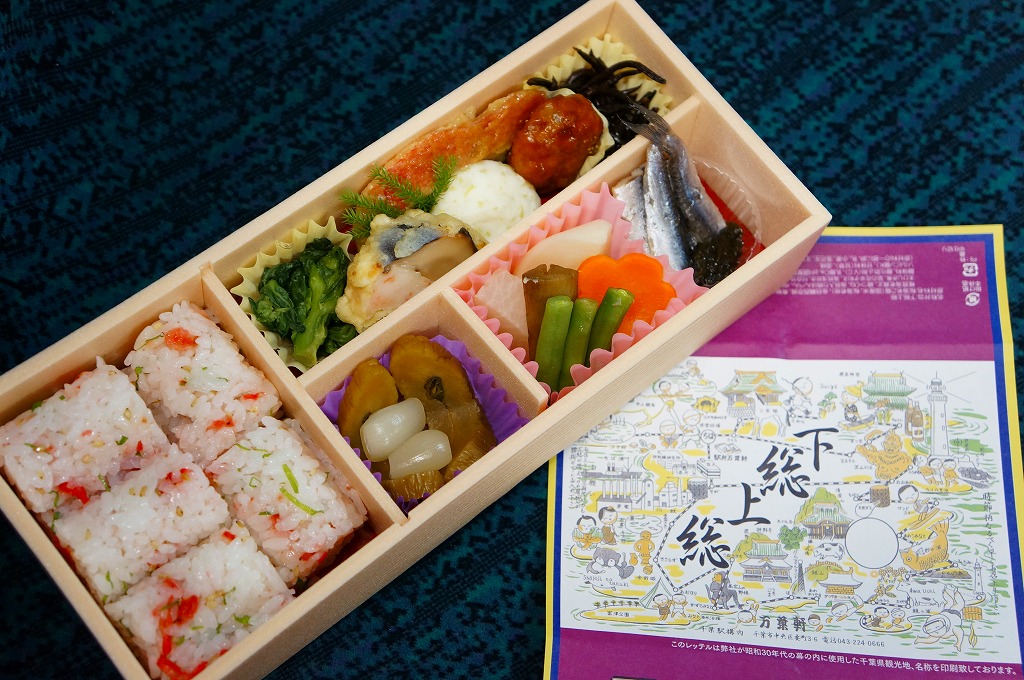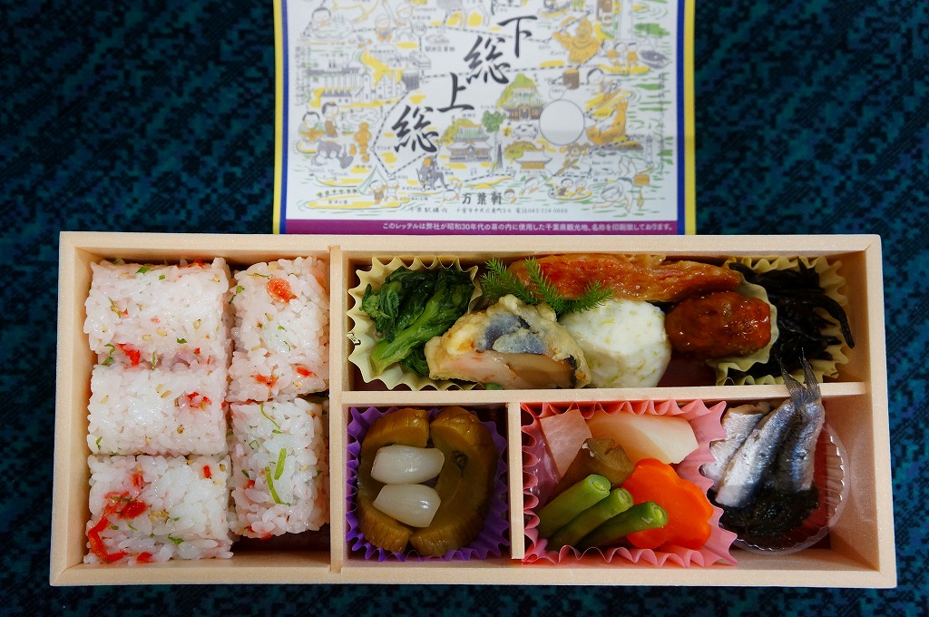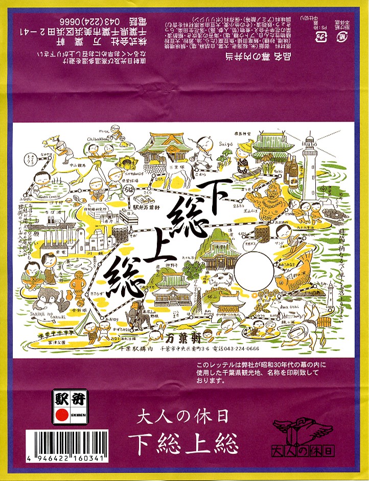 珍しく1業者で2種類も出す、千葉駅版の「大人の休日」駅弁のひとつ。木目調で柔らかな長方形の容器に、下総(しもうさ)と上総(かずさ)つまり現在の千葉県をほぼサポートするエリアの名所名物を隙間なく描いた、昭和30年代の幕の内弁当の掛紙の絵柄を載せた掛紙をかける。