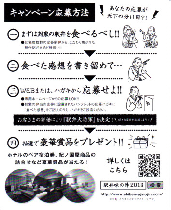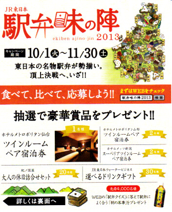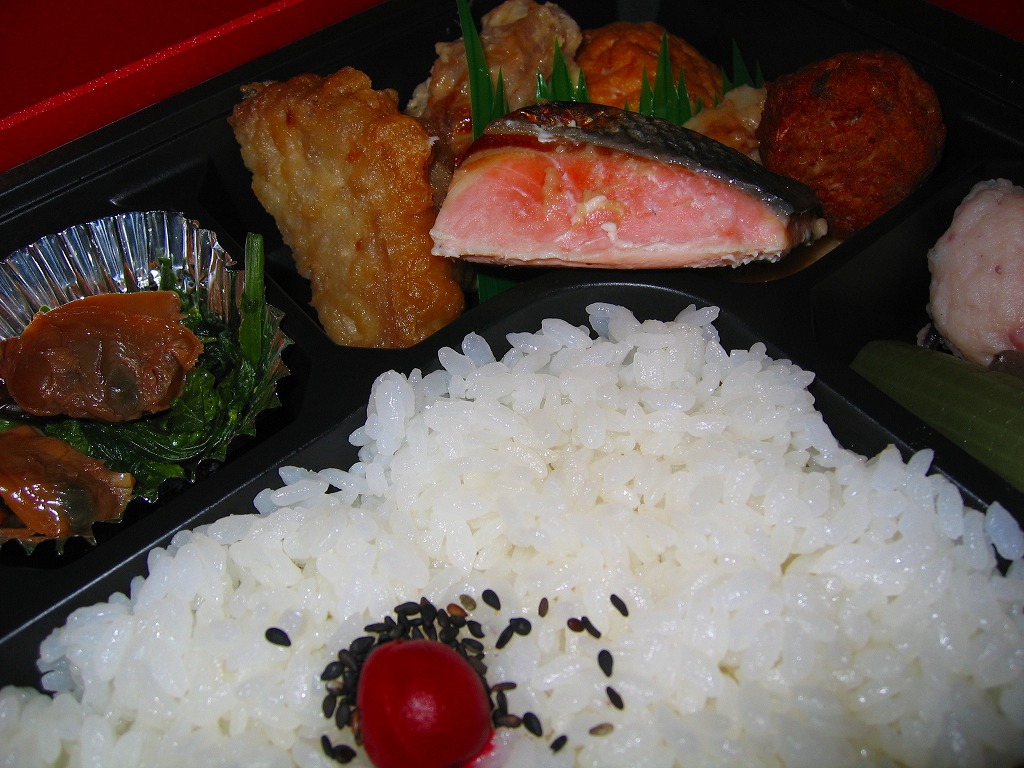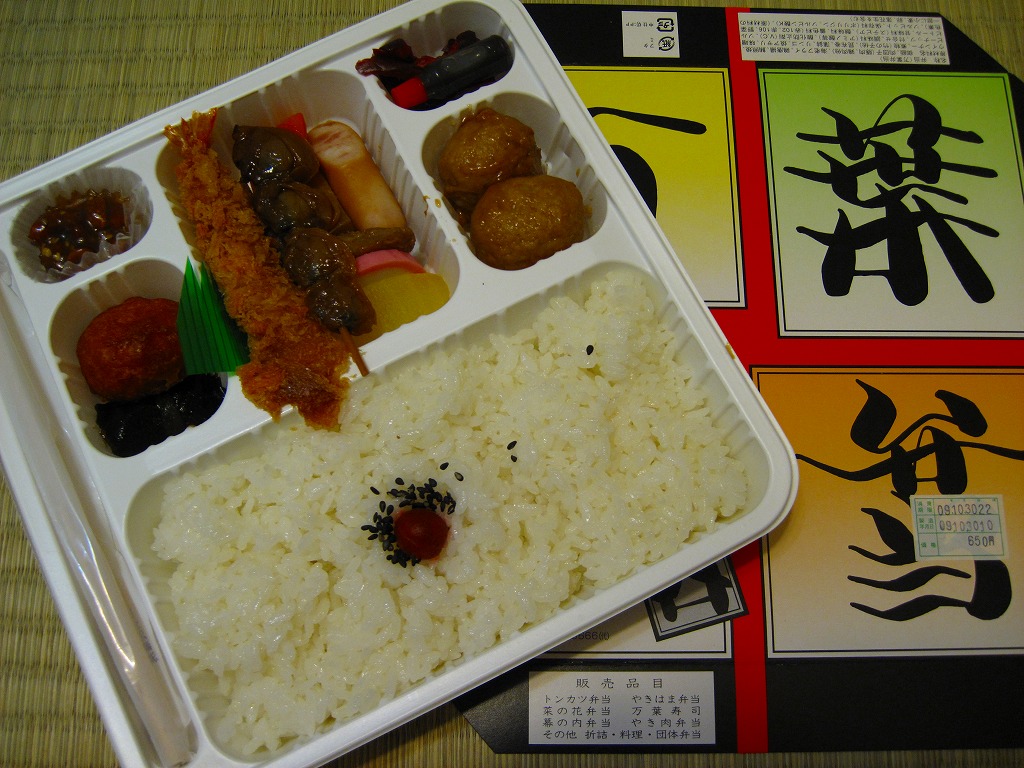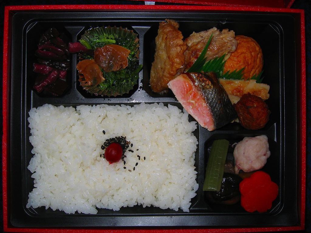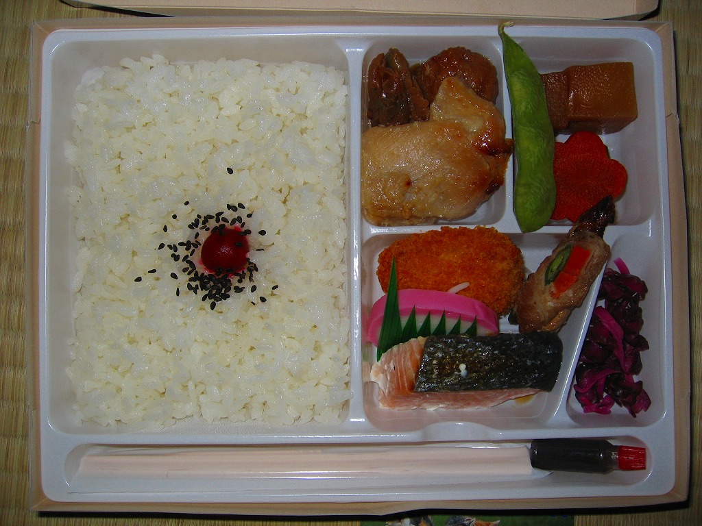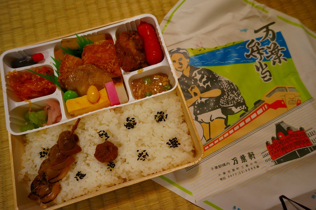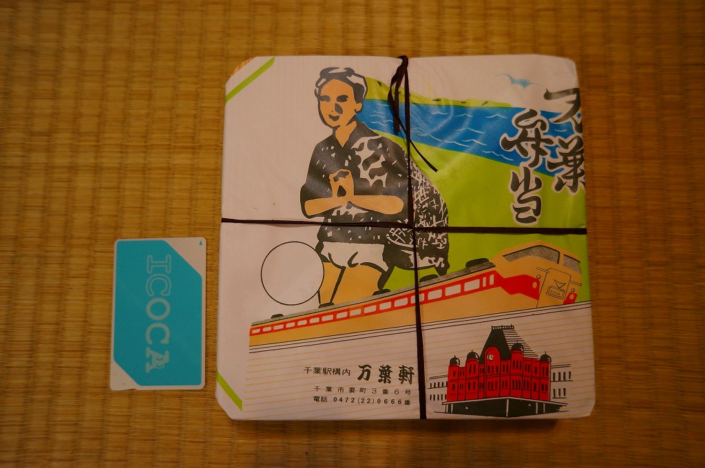 正方形の平たい経木枠の容器を、千葉の海岸と特急「さざなみ」と東京駅を描いたのではないかと思う掛紙で包む。中身は日の丸御飯にハマグリ串焼きを置き、サワラ照焼、紅白のかまぼこ、玉子焼、アジフライ、鶏唐揚、ウインナー、とりそぼろあんかけ、タケノコやニンジンなどの煮物、切りイカなどの佃煮その他を詰めたもの。掛紙のイラストが不思議ちゃんで、おかずの内容が昔風。今出しても売れないだろうが、時々は食べてみたい味。
