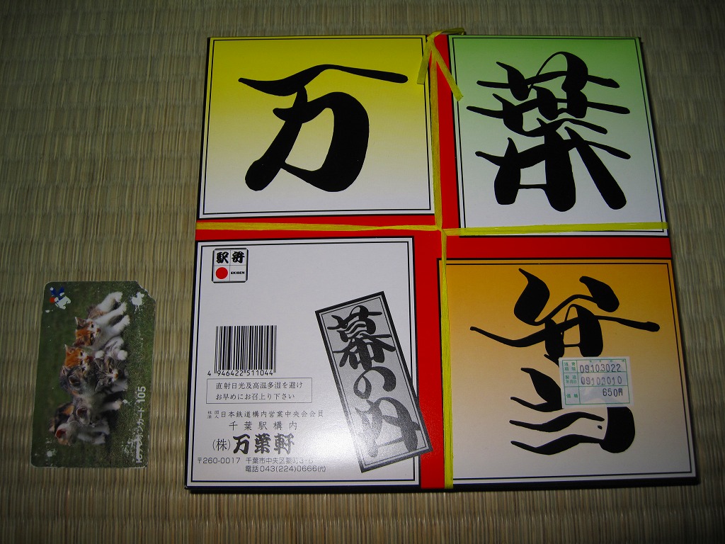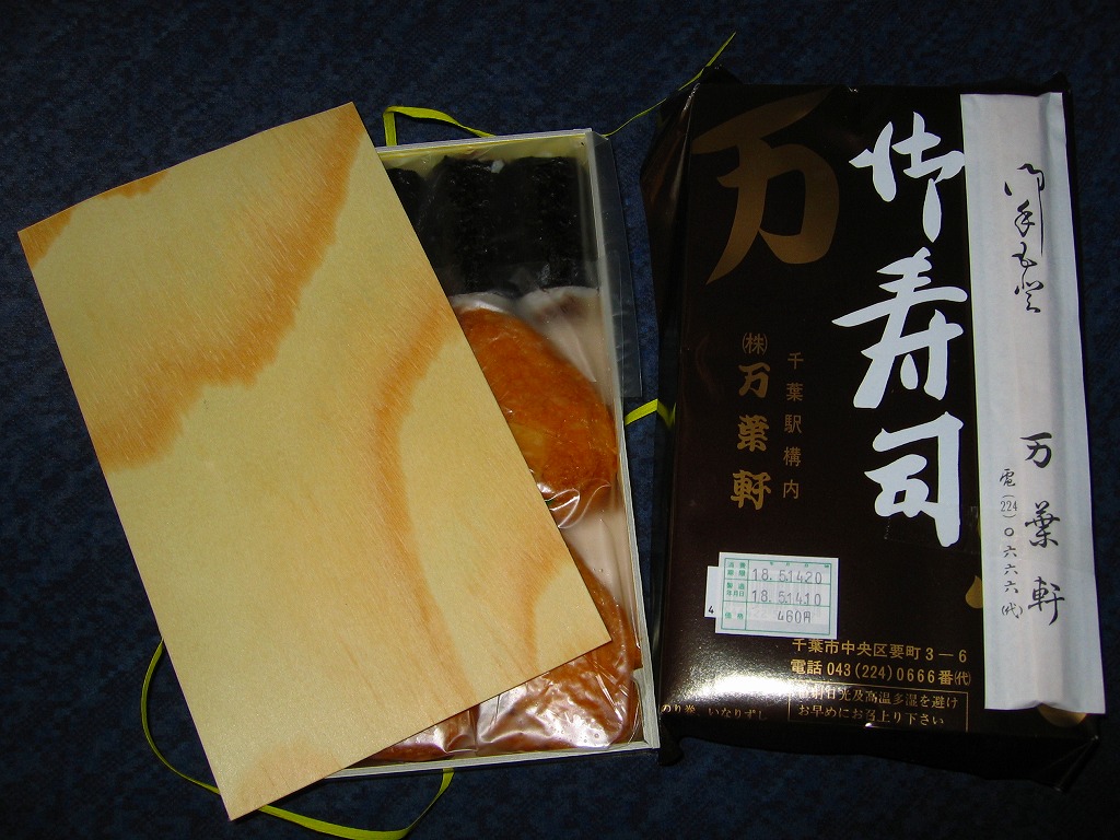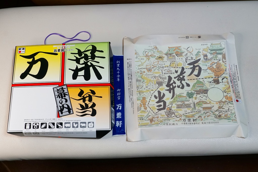 2011(平成23)年10月8日から10日までに東京駅で開催された「第14回東日本縦断駅弁大会」で販売されたお弁当で、過去の千葉駅弁を復刻したものだという。万葉弁当は上記のとおり現役の駅弁なので、40年前くらいの掛紙と内容を再現したのだろうか。
