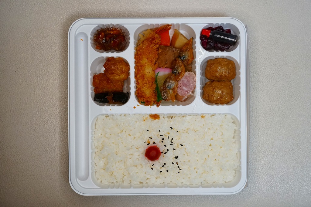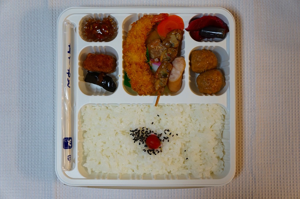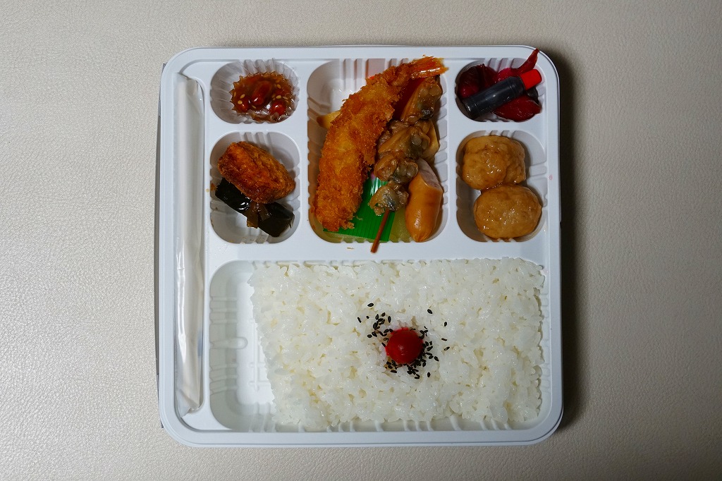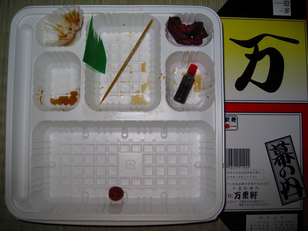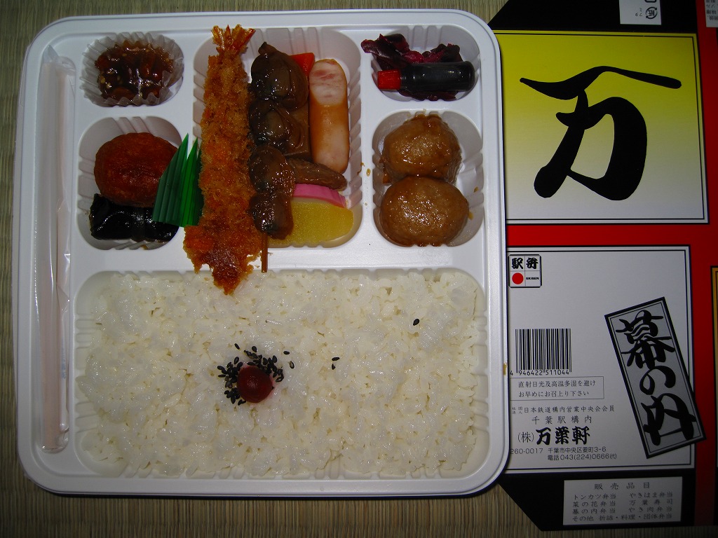 千葉駅で定番だという幕の内駅弁。正方形の白いプラ製トレーをそのまま使い、商品名や調製元を書いたボール紙でふたをして、ひもで十字にしばる。中身は日の丸御飯に肉団子、エビフライ、鶏唐揚、マグロ照焼、ウインナー、タケノコなどの煮物、昆布巻、かまぼこ、焼アサリ串、リンゴ、味噌ピーナッツ、柴漬け。