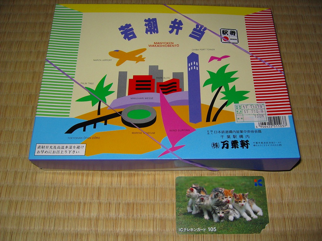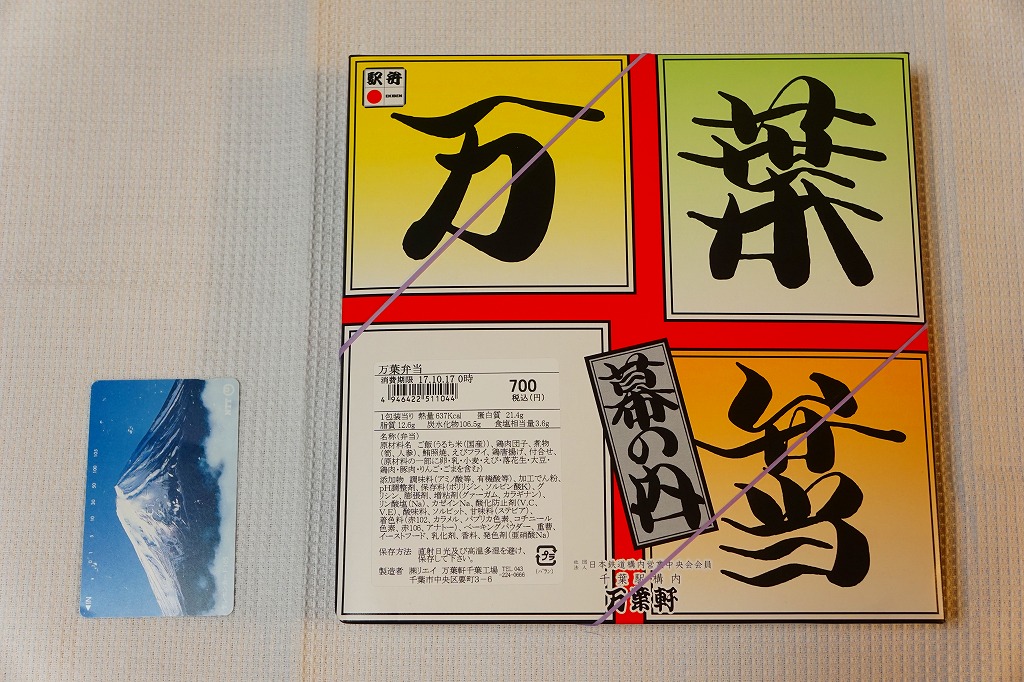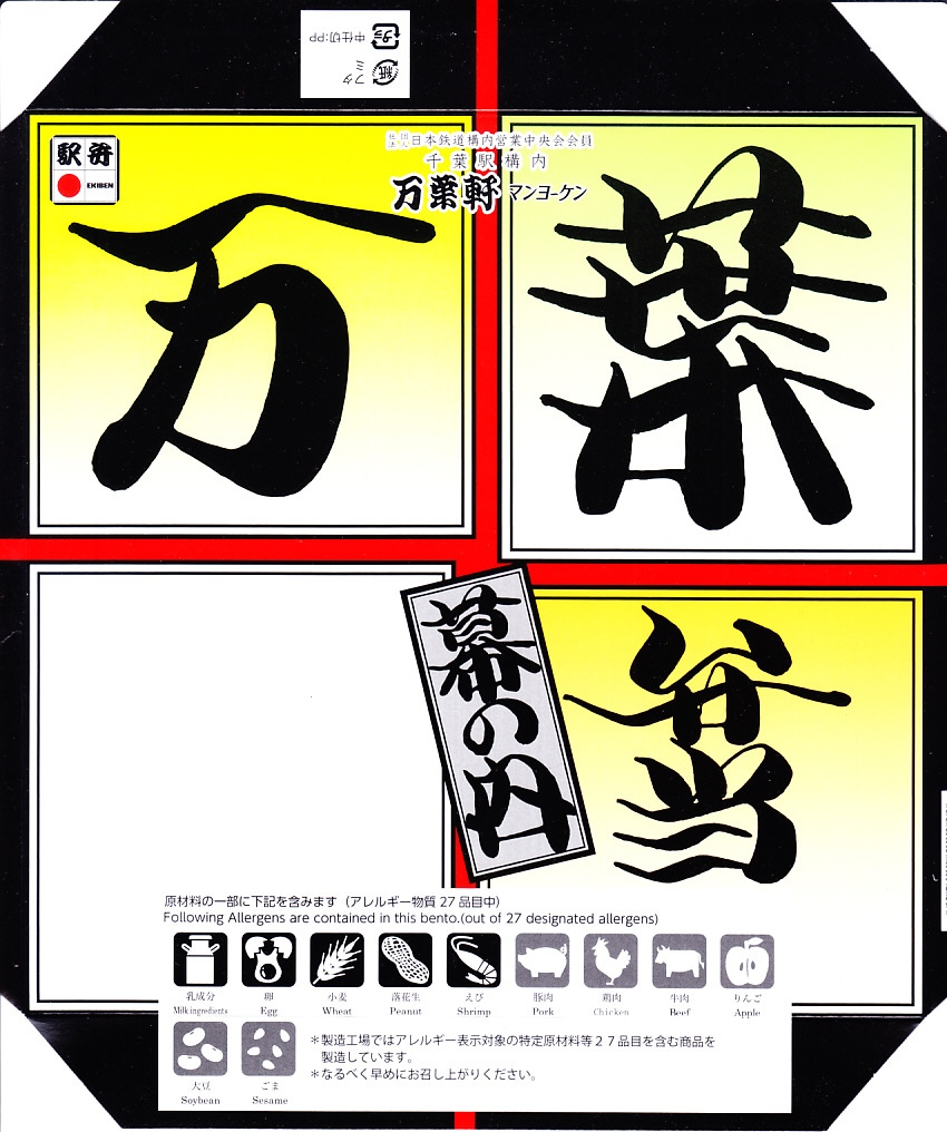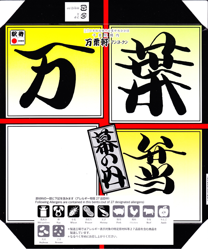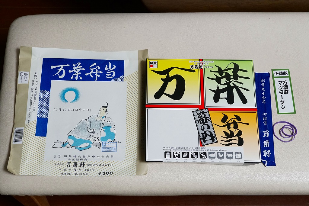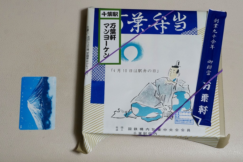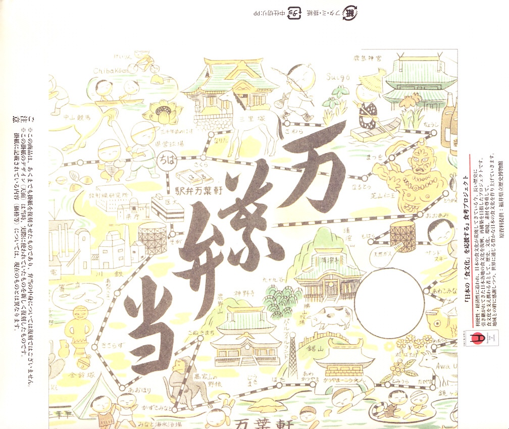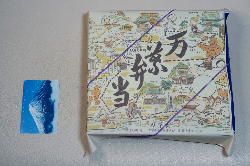 2024(令和6)年5月5日に購入した、千葉駅弁の掛紙とふた。同年4月1日から23日まで千葉駅で販売。駅弁の日に合わせ、日本鉄道構内営業中央会の会員のうち31社が各社おすすめ駅弁に共通ノベルティ「千社札風カード」を添付して期間限定で販売した駅弁の、千葉駅バージョン。いつも売られる「万葉弁当」そのものに、昭和時代の絵柄を取り入れた掛紙をかけて販売した。だから容器と中身と風味と価格は変わらない。