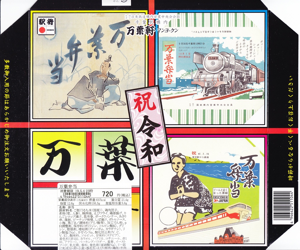 2019(令和元)年5月4日に購入した、千葉駅弁のふた。同月の改元を記念し、昭和時代と現在の掛紙等4種類の絵柄を並べ、中央に「祝令和」と記したものに差し替えた。容器や中身や値段は通常版と同じ。