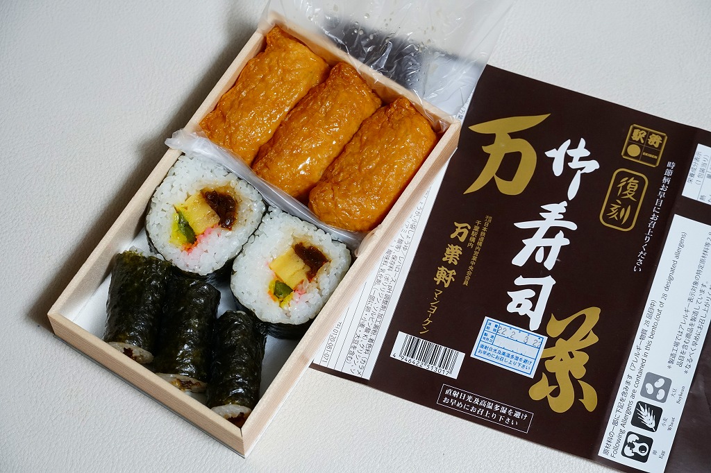 2020(令和2)年10月26日に発売。古くは「御寿司」の名で売られた助六寿司の普通弁当で、平成時代に万葉御寿司と改称、2014年9月に「惜しまれつつ終売となった」(調製元フェイスブック)ものを再販した。2021(令和3)年10月のJR東日本の駅弁キャンペーン「駅弁味の陣2021」に、新作駅弁としてエントリー。