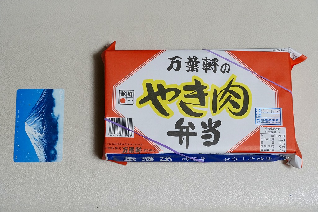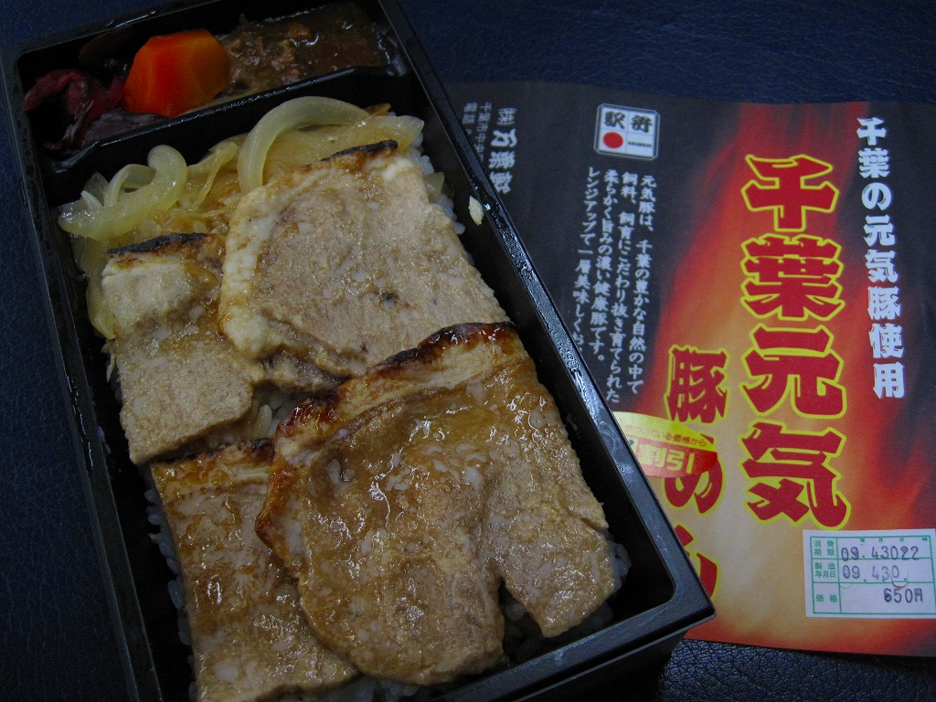 長方形の容器に白御飯を敷き、元気豚の焼肉と、タマネギとニンジンの炒め物を敷き、ししとうを載せ、きんぴらごぼう、菜の花おひたし、ピーナツみそを添える。過去に同じ名前の駅弁が出ていたが、これはその復刻や再販でなく、まるで千葉駅のB級グルメ駅弁「やき肉弁当」の別バージョン。固いわりに崩れやすい、薄い豚焼肉の味が、駅弁として個性的。