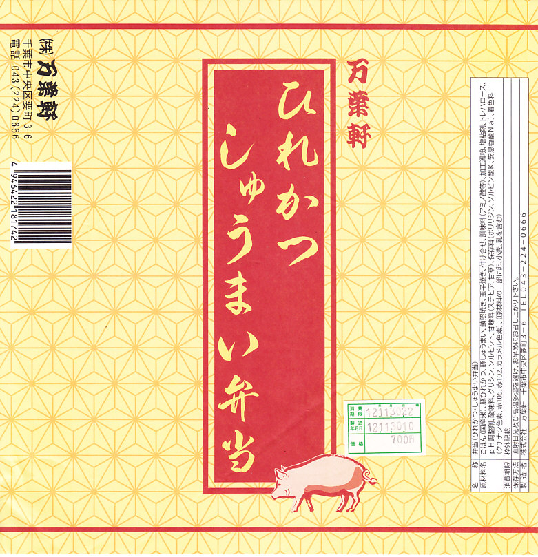 JR東日本の駅弁キャンペーン「駅弁味の陣2017」にエントリーするために、同期間中の2017(平成29)年10月から11月までの販売か。エントリー名は「千葉元気豚めし」で、食品表示ラベルでの商品名は「元気豚めし弁当」。「万葉軒」とだけ記した、千葉県の地図をくりぬいた黒い容器を使う。