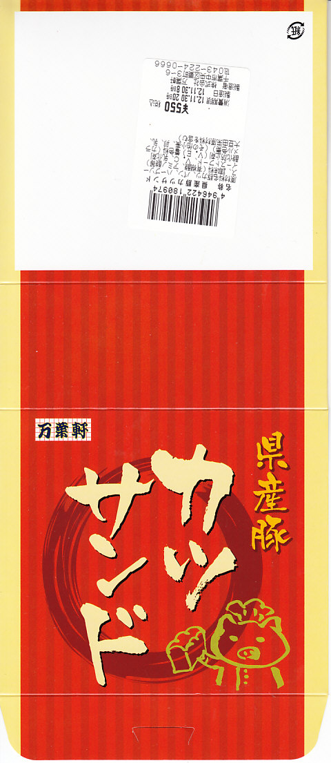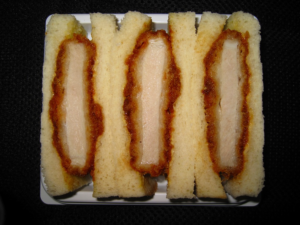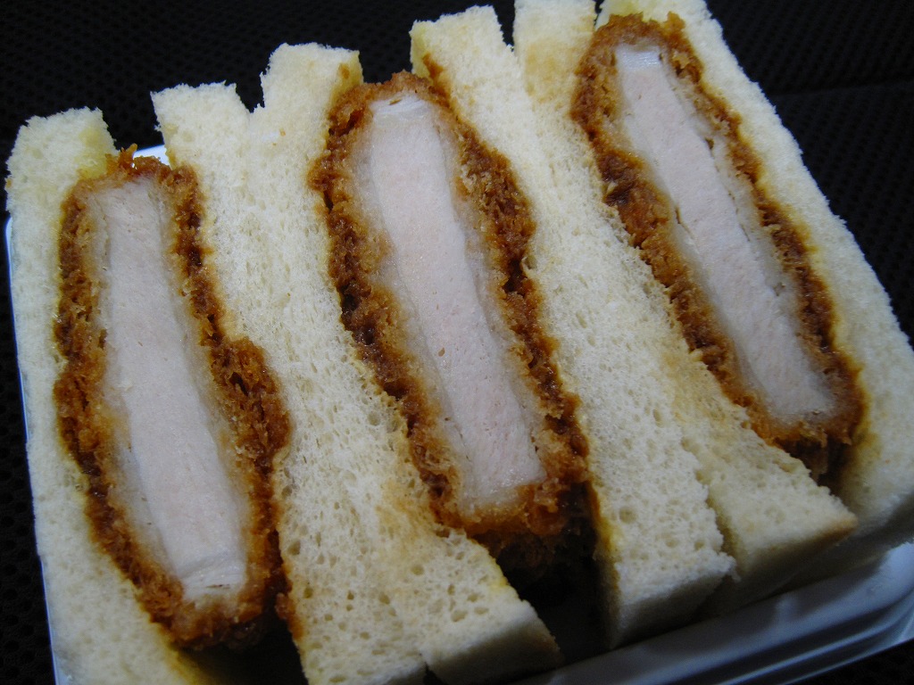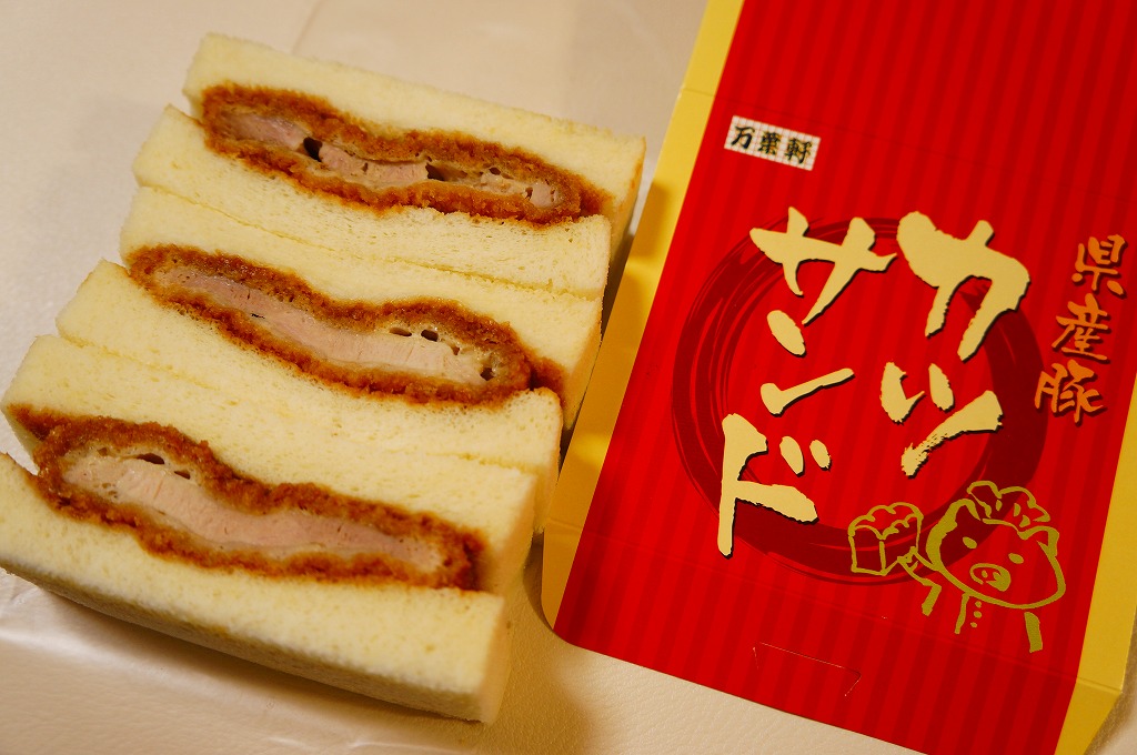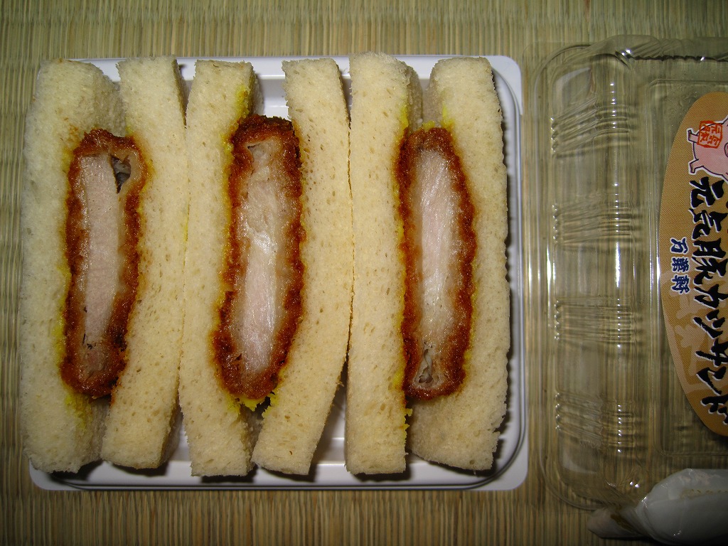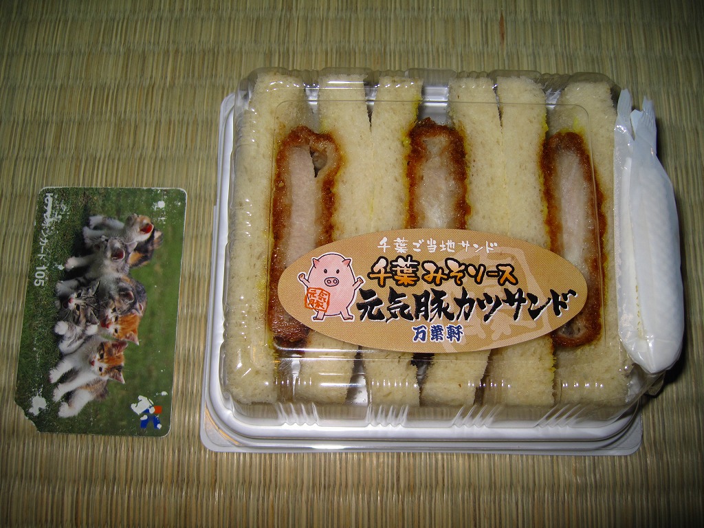 千葉駅の駅弁売店で駅弁とともに販売していた、駅売りのカツサンド。写真のとおり、ソースに漬けたロースカツを、辛子マヨネーズを塗った食パンに挟んでカットした、シンプルな普通のカツサンド。マヨネーズの効果で、油っぽいけれどトゲのない味になっていた。千葉駅弁には大変に珍しく、食品表示ラベルに製造委託の記号が付いている。「県産豚カツサンド」の発売により終売か。